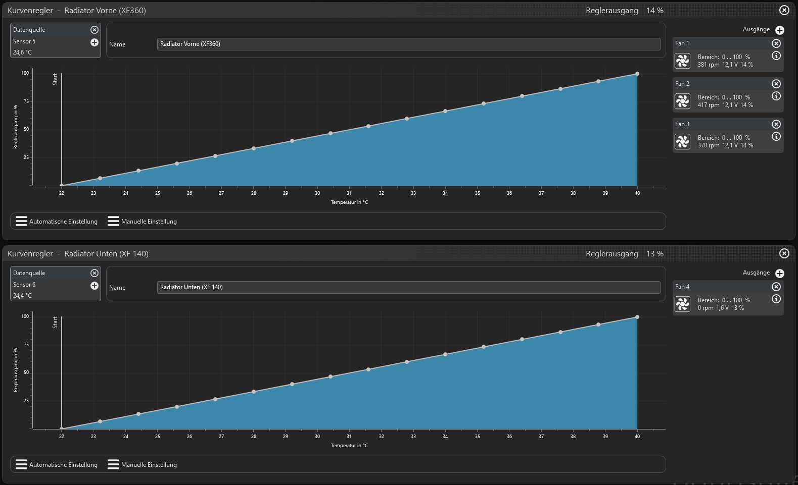 Der zweite Lüfter lässt sich nicht wirklich regeln. Erst Mal passiert gar nichts, ab einem gewissen Reglerausgang fährt er dann dierkt auf ca. 2600 Umdrehungen hoch.