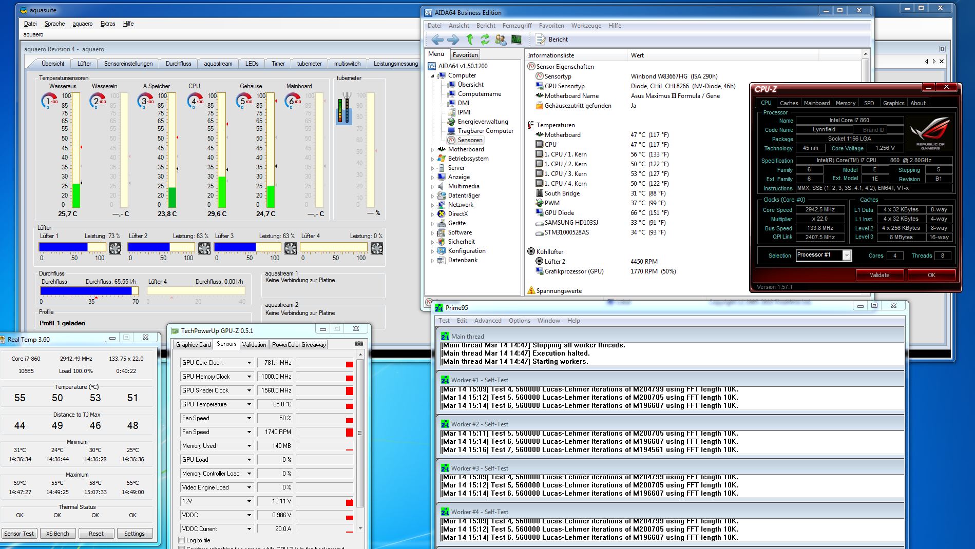 Ich habe die Messungen bei einer Raumtemperatur von 23,5°C gemacht, die Pumpen laufen wie man sieht immer unter Vollast, das wird sich sobald das AE 5 da ist, mit den Poweradjust2 aber ändern. Sollten die Messungen einigermaßen im genauen Bereich liegen, kann ich mit den Werten gut leben. Extreme Geräuschentwicklung durch die beiden Laing habe ich nicht, gut man merkt das sie da sind, es wirkt aber nicht negativ.