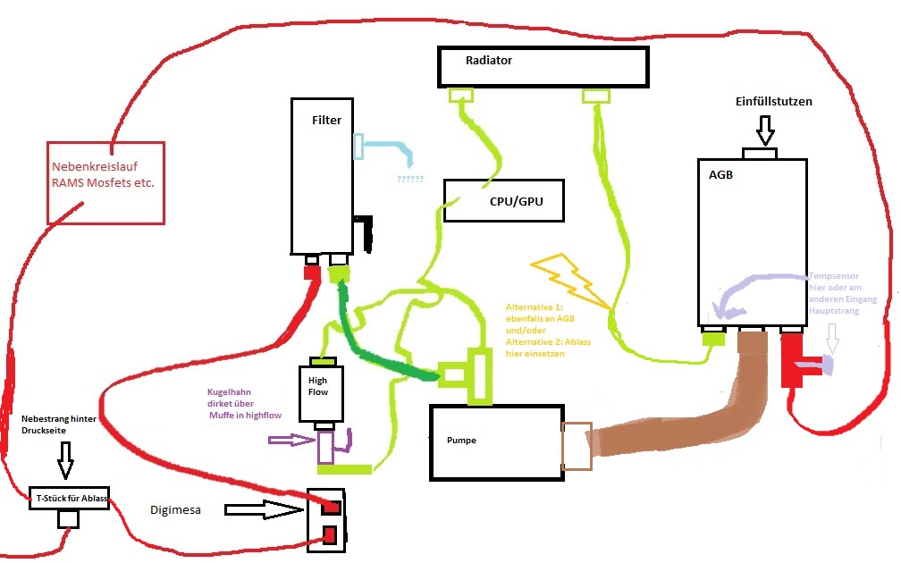 Zu der Skizze: Sieht ja nicht schlecht aus. Beim Rücklauf hätte ich bedenken, der Hauptstrom kommt vom Radi und geht in den 90°-Zweig des Verteilers. *zähneknirsch*