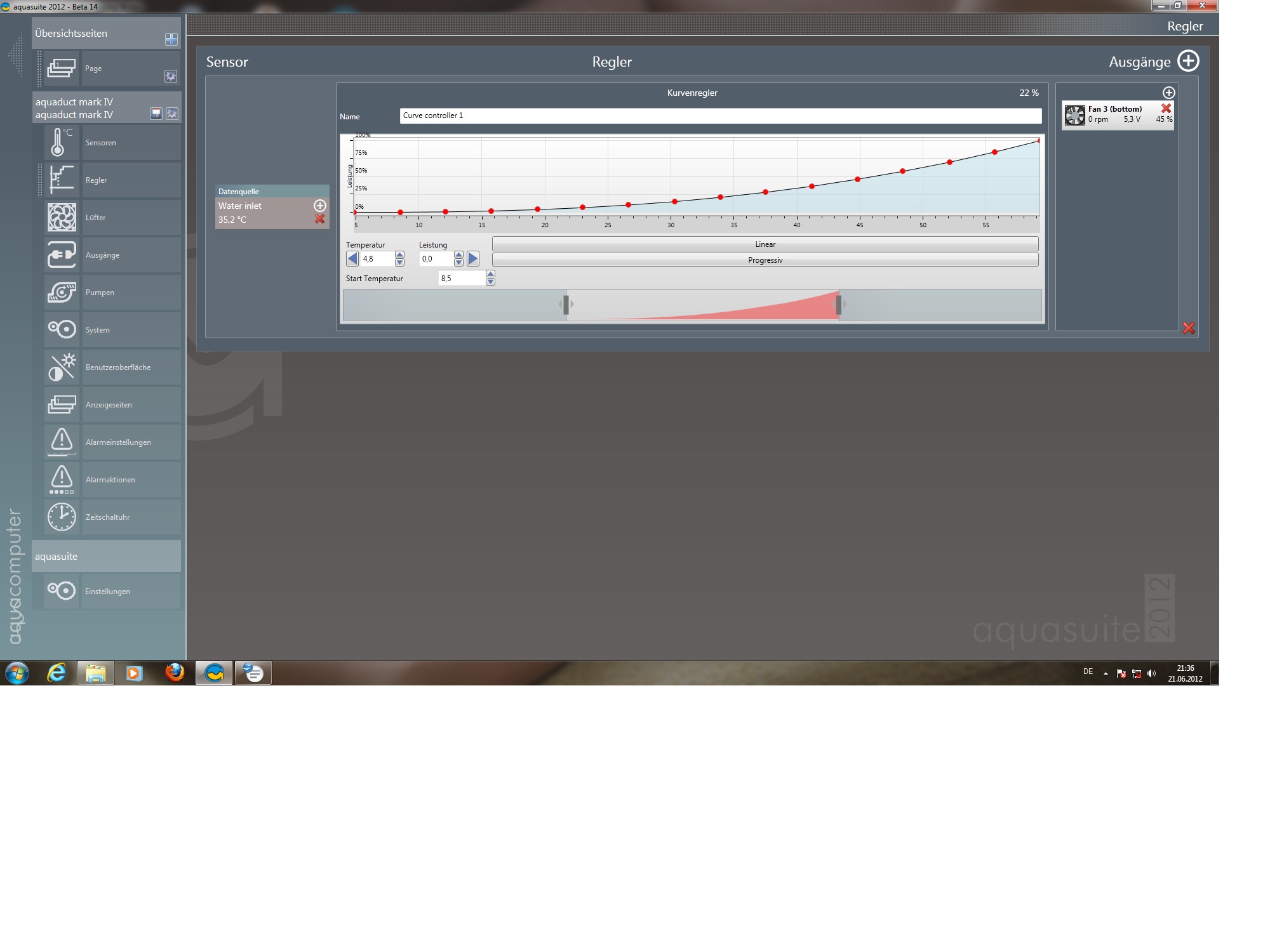 Alle Lüfter Manuel auf 80%, das System 2-3 Stunden unter Vollast aufheizen (Überwacht) und schauen wie heiß das Wasser wird. Wen dir die Temp gefällt machst einen Progressiven Kurgenregler mit den 80% ca bei der gemessen Wasser Temp wen nicht drehe die Lüfter noch Höher bis es passt und mach dann den Regler. So funktioniert es bei mir gut.