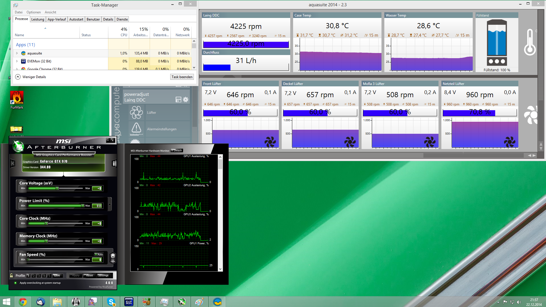 Für separate Desktop Hintergründe habe ich das Programm Display Fusion 5.0 laufen, darin ist der kleine um 90° gedreht und drin habe ich das Anzeigebild der Aquasuite permanent ab Systemstart laufen mit 5 Lüftergrafiken die sich bei Betrieb drehen.