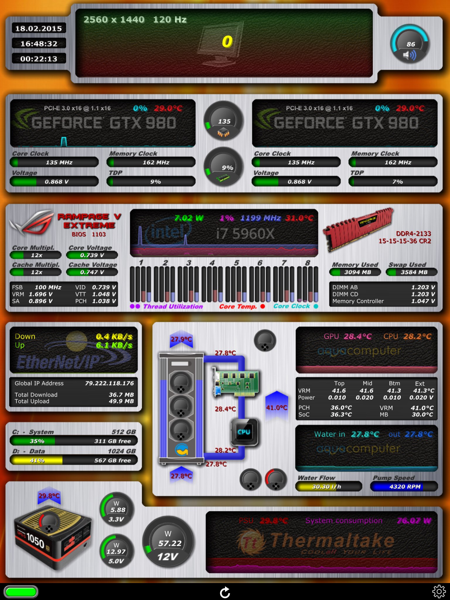 Da AIDA64 seit einigen Monaten die Aquaero WaKü Steuerung unterstützt und das Panel nun auch auf Tablets (genauer: jedem Gerät, welches einen Browser hat) angezeigt werden kann, hab ich mal ein paar Tage (eher Wochen) investiert, um mir ein schönes Panel zu bauen, so wie ich mir das vorstelle.
