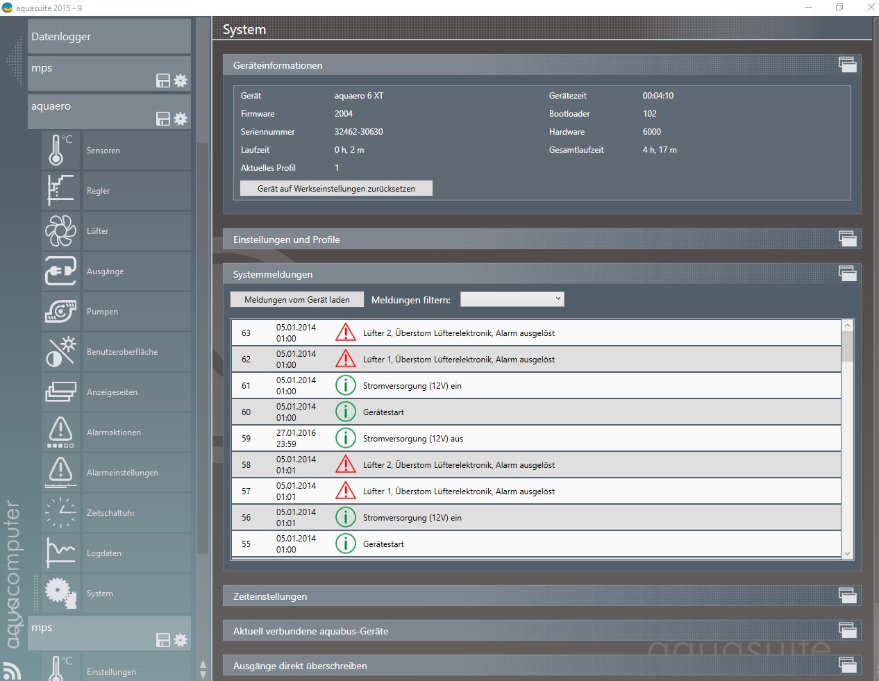 dann hast du den Startstrom/Stromüberwachung warscheinlich viel zu gering eingestellt. Passiert das auch mit audgeschalteter Strmüberwachung?Nach dem Trennen vom Strom funktioniert es einwandfrei bis zum nächsten Restart und das zieht auch jedes mal eine neue Konfiguration mit sich was sehr mühsam ist nach dem ich es ziemlich optimal mit Startstrom usw. eingestellt hatte. Weiter muss ich sagen das ein Wasserkühler montiert ist auf dem Aquaero.