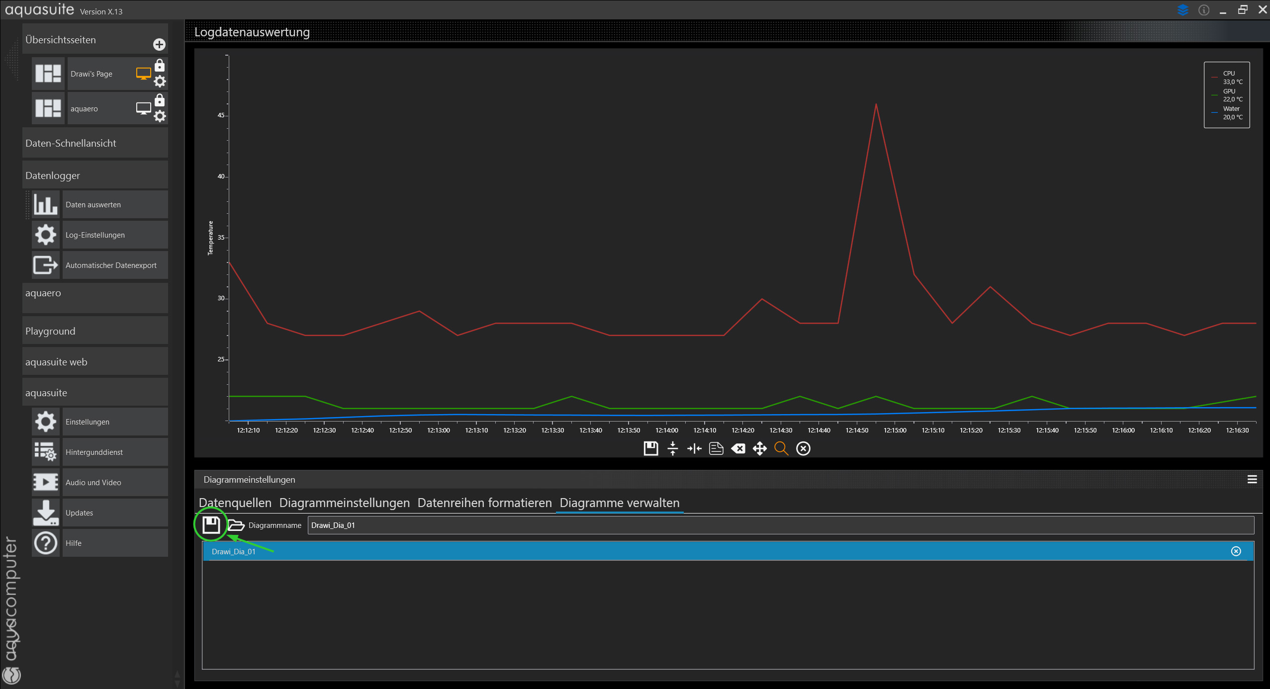du musst die Diagrammeinstellungen auch speichern. dann eventuell einmal die aquasuite neu starten, sonst aktualisiert sich das Diagramm auf der Übersichtsseite nicht sofort.