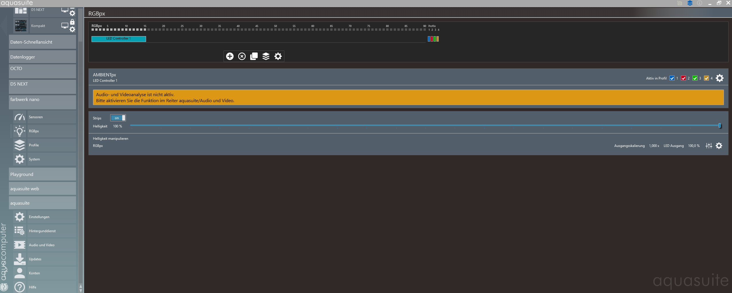 das ist es in der Tat, wenn die Audio Analyse aus ist kommt beim Farbwerk Nano auch diese Meldung, das ist dann mit der nächsten aquasuite Version gefixt. Vorerst muss dann die Audio Analyse aktiv sein.