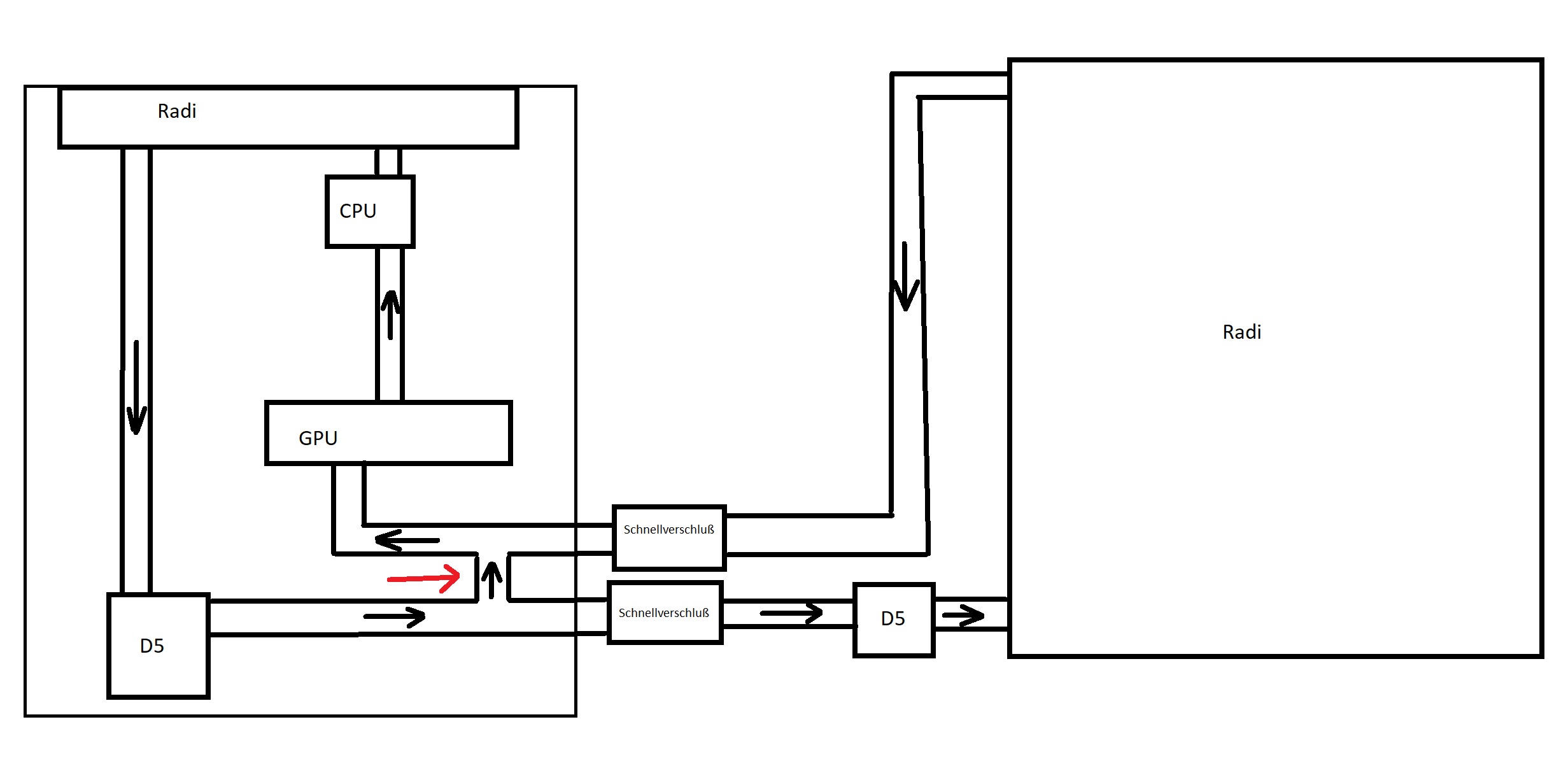Ich habe zwar nur externe Radis, aber ich habe es so gemacht, dass ich meine Schnelltrennkupplungen verdreht eingebaut habe, also so das an den Schläuchen, die aus dem Case kommen jeweils ein männlicher und ein weiblicher hängen sodass ich die zusammenkuppeln kann um den Loop zu schließen ohne Radis (zum befüllen). Schläuche hängen aber so 20cm aus dem Case heraus.