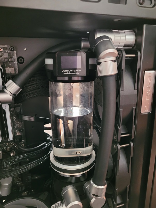 Hardware: 10/16 EK ZMT Tubing, 1x Pumpe D5 PWM, 1x360er, 1x240er, 1x120er Radiatoren. 1x CPU Block Heatkiller IV (schwarz vernickelt), 1x GPU Block von Bykski (vernickelt), 1x PCH Block von Watercool (nicht vernickelt), 1x High Flow Next flow meter. 6x45* und 6x90* Fittings. Hardware ist Ryzen 5 3600, Asrock X570 Taichi, GPU eine 3070.