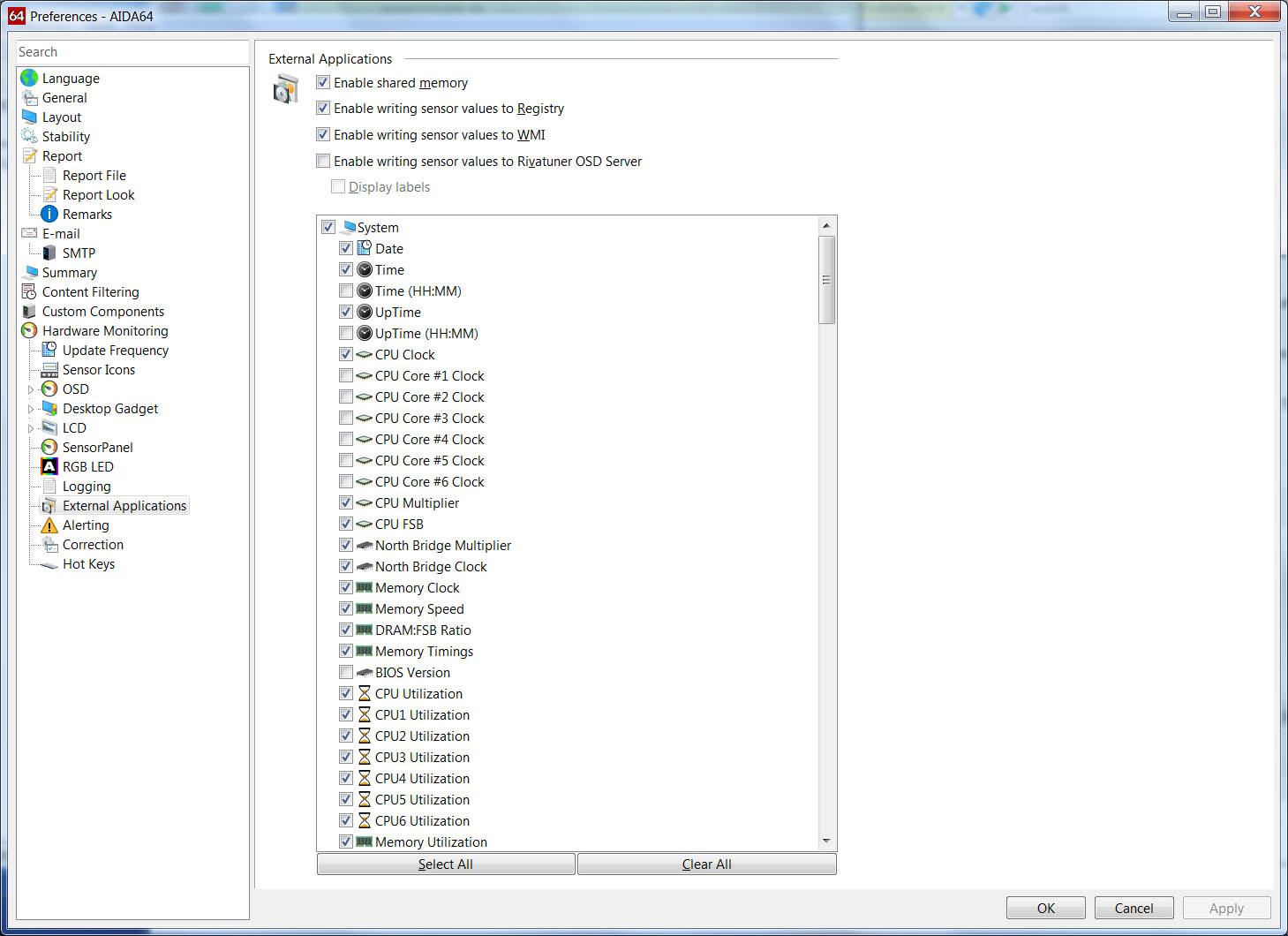 I tried the re-install choosing the 'remove everything from the program folder', but keeping my settings, but that also had the problem where I couldn't see any Aida64 values.