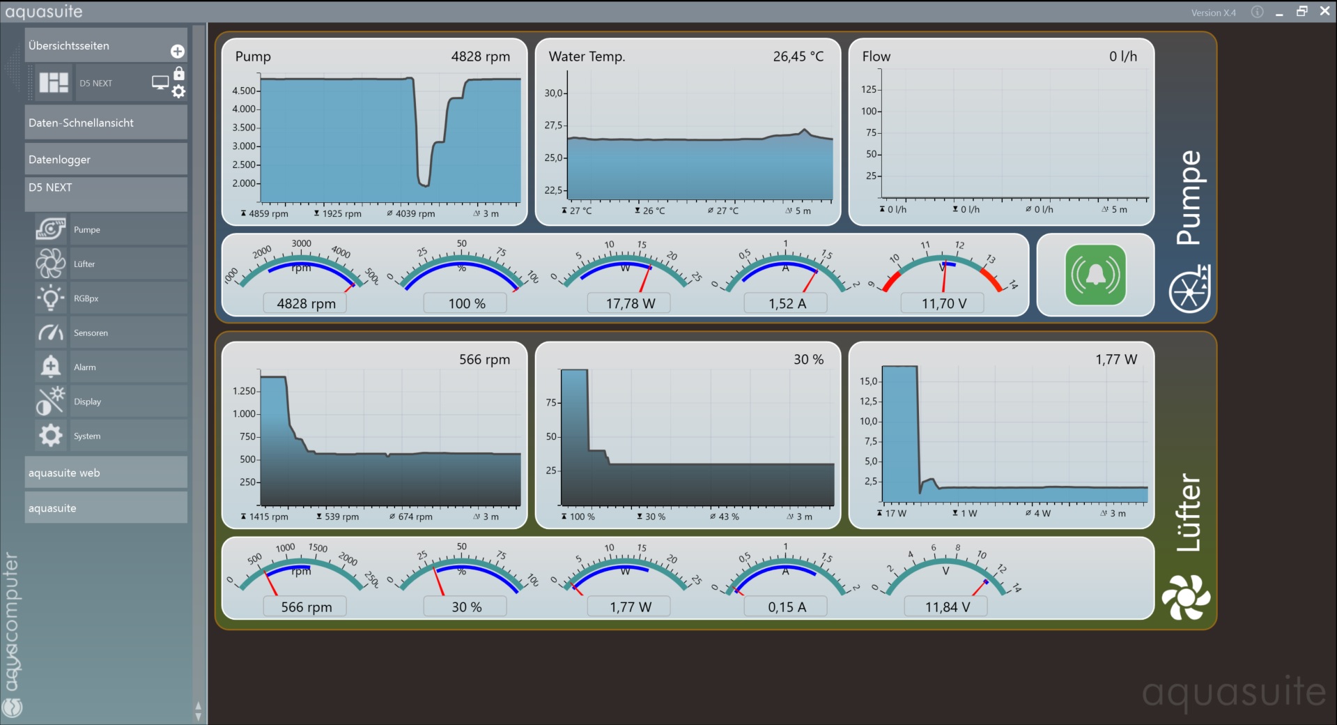 Zur Kalibrierung, einfach einen Kugelhahn im Kreislauf zumachen, die Pumpe ohne den Rechner starten und kalibrieren, ist die Kalibrierung fertig sagt das die Pumpe, dann kann der Hahn wieder geöffnet werden (siehe auch Seite 48 der Anleitung).