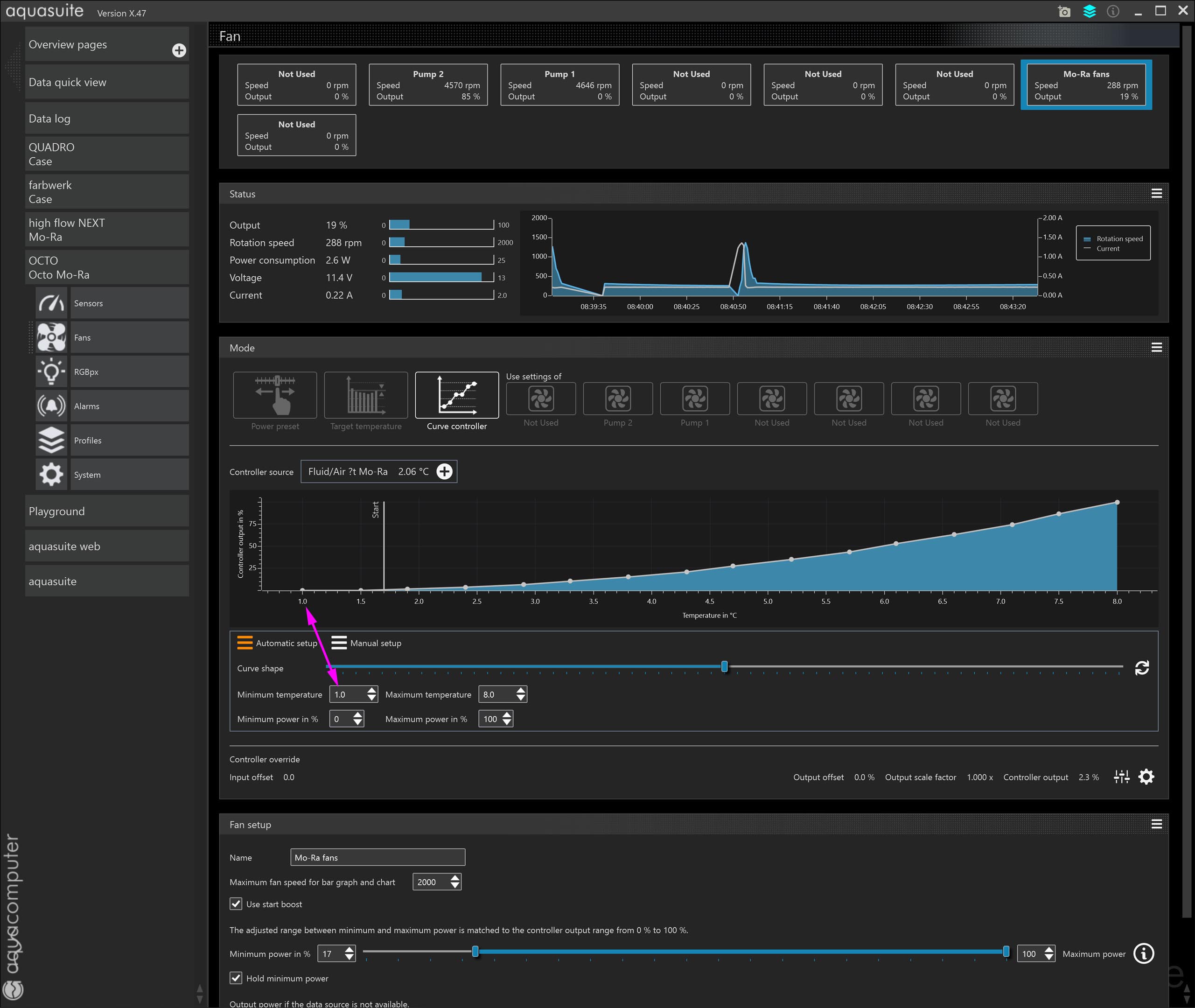 System start today had PWM port 3 (pump 1) at Power preset, and PWM port 7 (fans) low temp at 1°.