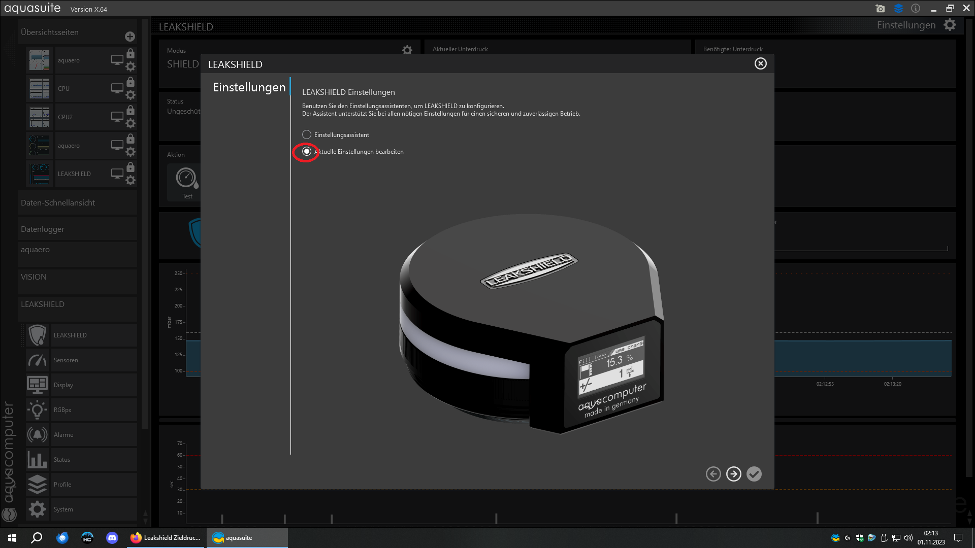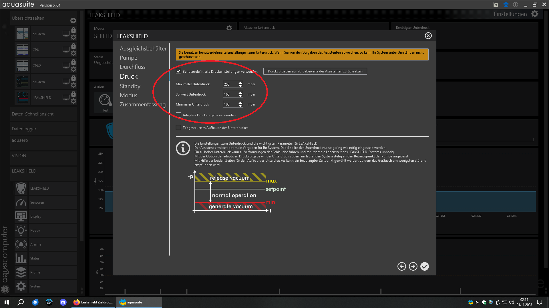 Um deine Frage zu beantworten, ja der Zieldruck ist einstellbar. Dazu solltest du in der Aquasuite das Setup für das Leakshield einmal komplett durchklicken.