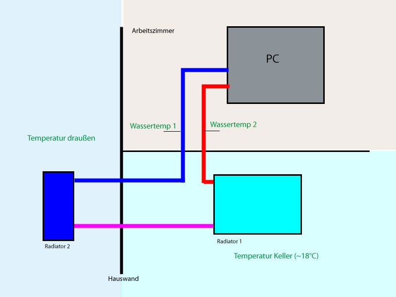 Zum generellen Verständnis: Der Außenradiator ist ein Airplex 120 mit 2 normalen 120er lüftern drauf in einer dicken Isolation mit luftkanälen. Der Radiator im Keller ist ein Autokühler mit einer aktiven kühlfläche von ca. 35x50cm die über eine große Lüftervorkammer durch 2 UltraKaze 120mm (je 7 Watt, 224 m³/h, 45,6dBa) belüftet wird.
