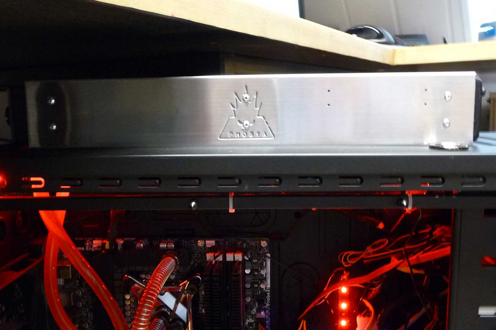 Den Knickschutz wirst relativ leicht los. Bei der Kühlung gibt es keine feste Reihenfolge für die zu kühlenden Teile. Richtig ist was gut aussieht und vor allem dir gefällt. So wie das auf den bildern aussieht, hast du absichtlich keine Winkel. Nichts gegen zu sagen, wenn man denn Durchflussfetischist ist. Bei dir würde ich doch nicht ganz auf die Dinger verzichten, wenigstens einen an die Grafik mit. Durch den würdest du gut vom der SB zur Grafik kommen. was mich aber ein bißchen irritiert ist, das ich die Leitung von der Southbridge und vom Spannungswandler zum ?( nicht finden kann. Hast du für das Board nen Konplettkühler? Wenn ja ist die Verschauchung ohne Knickschutz und ohne Winkel leicht. Machst du die Reihenfolge Spannungswandler (Ausgang vom Komplettkühler) --> Grafik--> CPU--> Radiator müßte das funktionieren. Den Schlauch Grafik/CPU hälst du sammt den Knickschutz unter heißes Wasser und läst den dann wieder kalt werden. Dann kannst den Knickschutz ab machen, der Schlauch bleibt dann auch so in Form. Und den Durchflußmesser würde ich versuchen, rechts oben neben das Board zu machen. Kommst vom Radiator zum Dfm und dann zur Pumpe auch ohne Winkel aus. Naja und die Rummelbude... ;) Kannst ja evtl die LED Streifen an das Seitenteil pappen oder so im Gehäuse befestigen, das sie nach innen strahlen. Wäre auch alles richtig rot, würde aber nicht so in den Augen brennen.