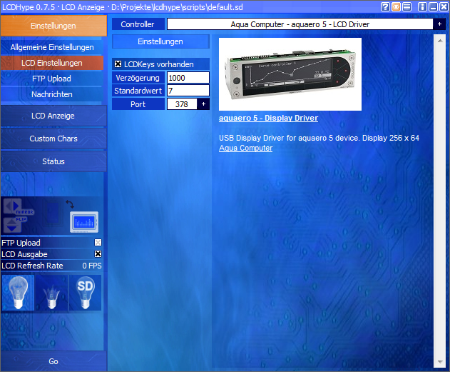 Ich habe LCDHype komplett neu installiert, diesmal mit den Default Pfad Einstellungen. Dann habe ich vor dem ersten Start von LCDHype die Aquaero Zip Datei ausgepackt und in das Controller Untermenue ausgepackt. Das habe ich gemacht, weil LCDHype beim allersten mal etwas langsamer lädt und man auf dem Startbildschirm besser mitverfolgen kann welche Displaytreiber geladen werden. Ich habe da gesehen, daß der Aquaero-Treiber auch geladen wurde. Allerdings stand im Programm selber kein Aquaero Display in den Einstellungen zur Auswahl.