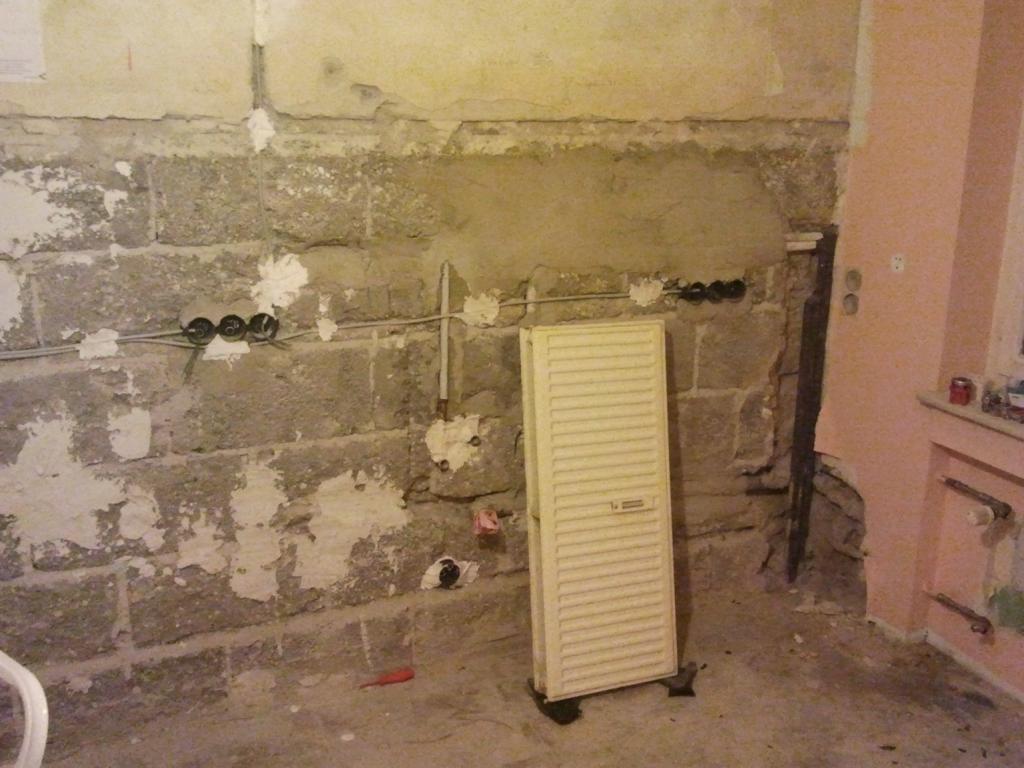So heut nochmal 40kg Putz an die Küchenwand gehauen.... Sieht man irgendwie nix von ^^ Morgen werd ich mal noch 60kg ran machen, dann kann mein Dad nächste Woche schön glatt putzen.