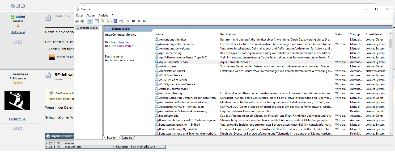 Wenn in der Daten-Schnellansicht die "Daten aus Aqua Computer Dienst" nicht angezeigt werden, sieht es so aus, als ob die Aquasuite nicht mit dem AC Service kommunizieren kann.Aber alles ohne Erfolg, in meiner Daten-Schnellansicht erscheint nur der Ordner aquaduct eco und nur diese Sensoren kann ich verwenden.