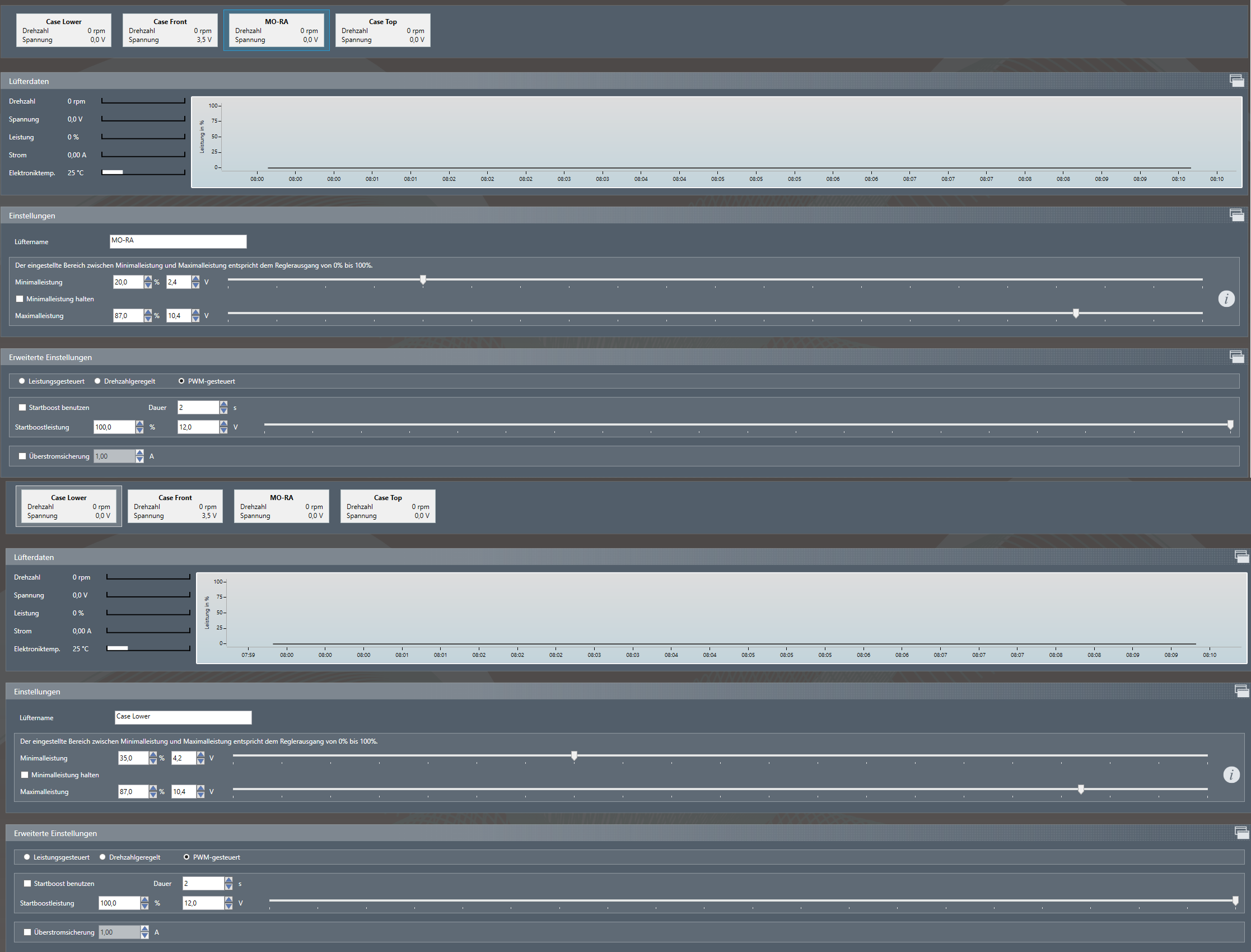 hier sind meine Einstellungen, der obere Ausschnitt gehört zu dem Lüfter der relativ langsam ist und der untere zu dem, welcher so aufdreht.