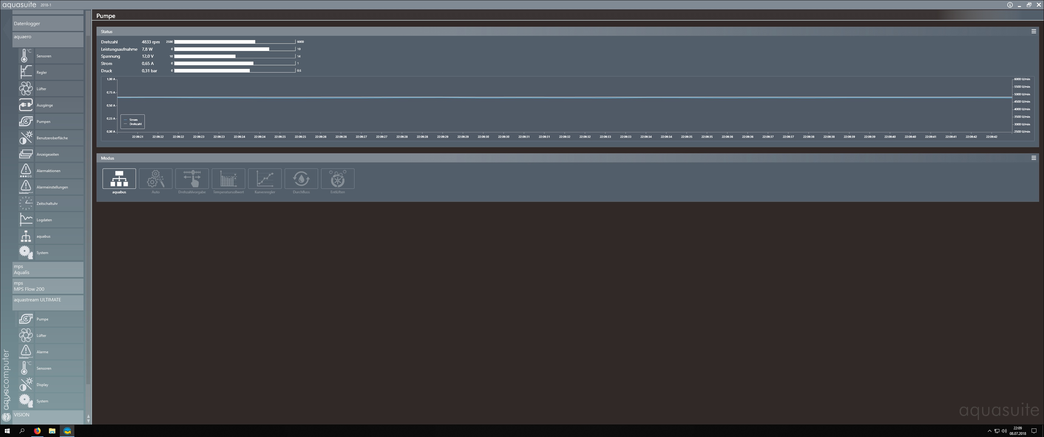 Hallo, ich habe seit heute die Aquasuite 2017-3.2 installiert. Im PC stecken eine EK Water Blocks EK-XTOP Revo D5 RGB PWM - Plexi (inkl. Pumpe) an einer Aquaero 6 LT sowie ein Durchflusssensor Highflow/USB. Der Sensor wird korrekt erkannt. Die Pumpe wird am Aquabus High nicht als Pumpe erkannt. Statt am Aquabus High kann ich sie auch als Lüfter anschließen. Dann wird zumindest die Drehzahl angezeigt.