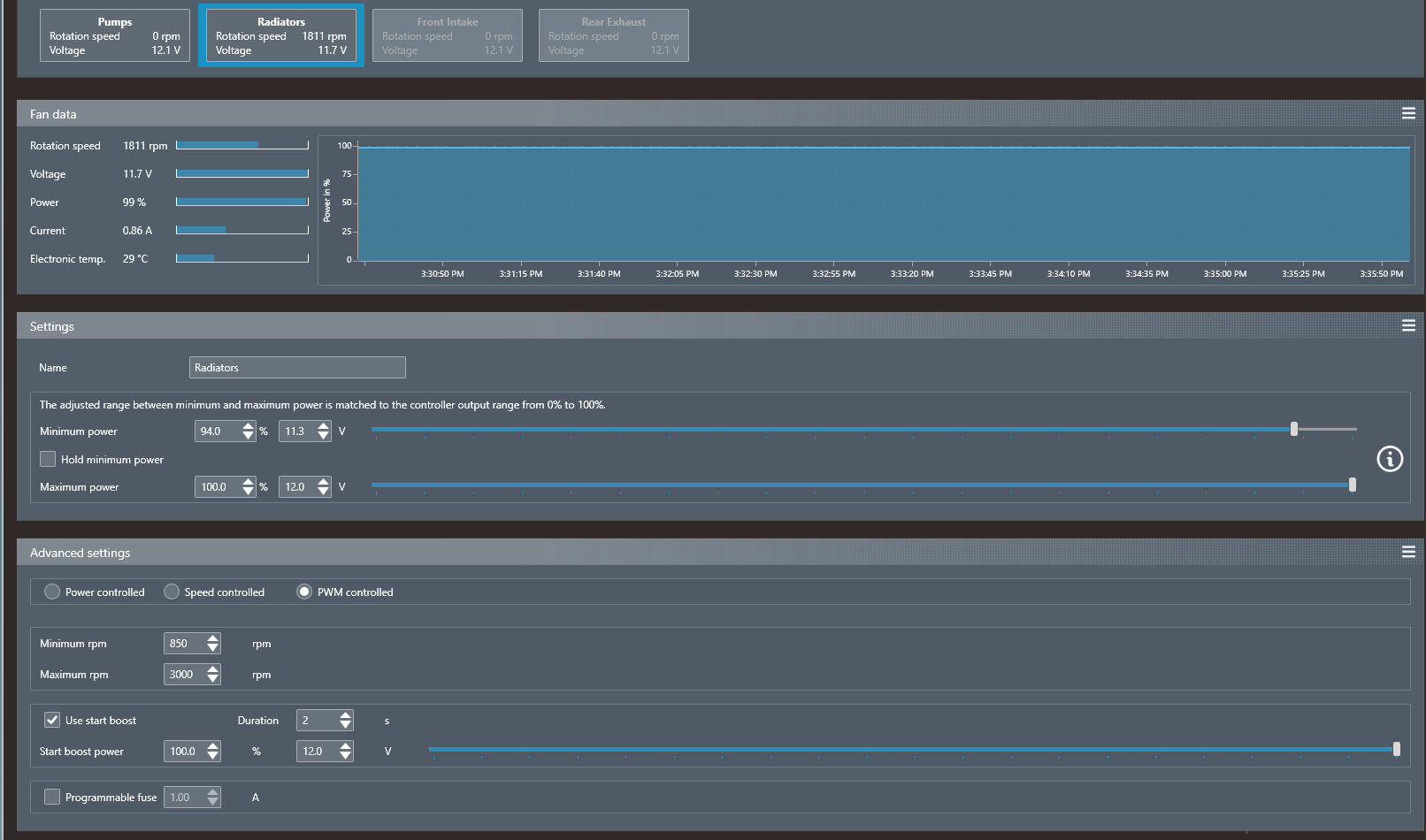 Based on what I have seen playing with the software, the output will drop voltage even though I have PWM selected and seems unreliable from day to day. I have attached a picture of the settings that I have that seem to be working fine right now. My issues are the PWM is inconsistent and I will see fluctuations in rpm speed, will not maintain a base rpm speed and jumps from about 2k to 3k rpm with no in between setting.