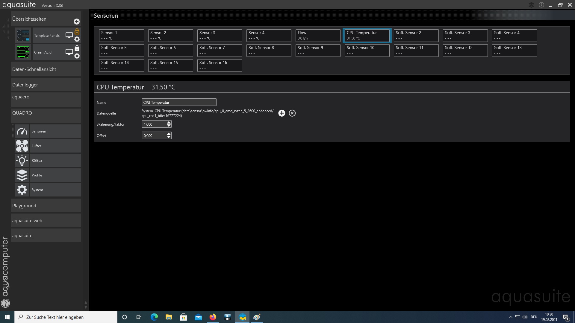 Hab mal 2 Bilder angehängt. So sieht das bei mir aus, wenn ich im Quadro den Softsensor konfigurieren, Ich empfehle dir auch satt des Aquasuite-Hardware-Monitoring auf Tools wie HWinfo zusetzen.