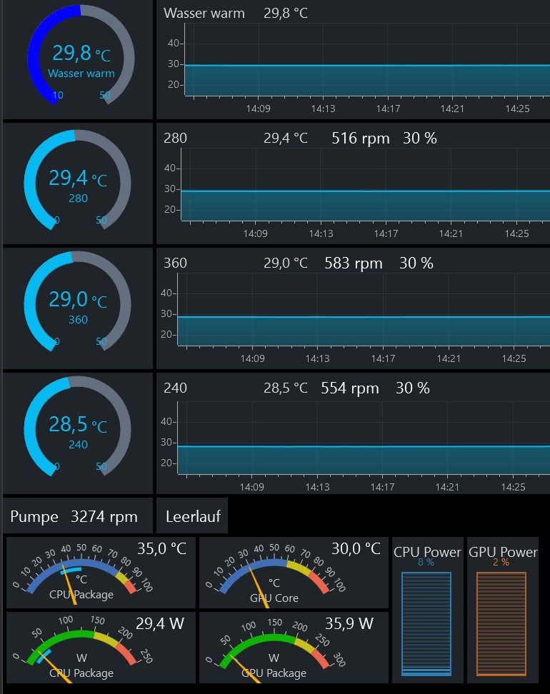 In der Übersicht lasse ich mir die Temperaturen, Pumpendrehzahl (Volumenstromsensor leider ausgefallen), aktuelles Profil (über Ausgaben) sowie Temp und Leistung von CPU und Graka anzeigen (siehe angehängtes Bild).