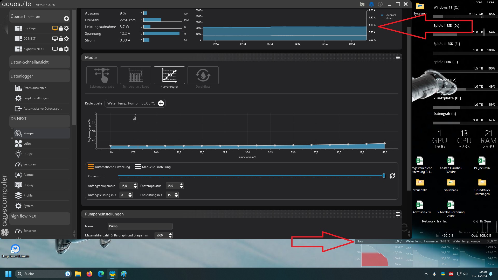 Als ich den PC frisch zusammengebaut hatte, hatte ich einen Durchfluss von ca. 60 l/h bei 2% Pumpenleistung und ca.180l/h bei 100%.