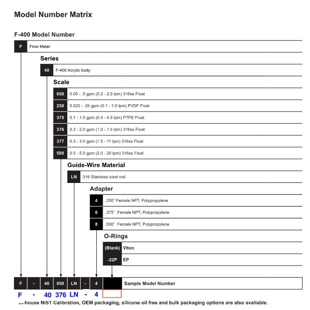 That is correct, except I don't think every combination is an available optionI am curious about the flow meter and the fittings that screw into it. IIRC from another post, that is a Blue-White F-400 series. I am considering buying one of these and have been reviewing their documentation. I think the model I want is the F-40_376_LN-4. [attach]10577[/attach]