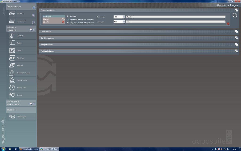 ich habe die aktuelle Version Beta 15 mit aquaero 5 1025; auf der Seite "Alarmeinstellungen" habe ich Temperaturalarme mit "Temperatur überschreitet Grenzwert" ausgewählt; wo kann ich jedoch die Grenzwerte einstellen?? Rechts davon wird zwar der Text "Warngrenze" und "Alarmgrenze" angezeigt, ich habe jedoch nirgends ein Feld zum Einstellen gefunden.