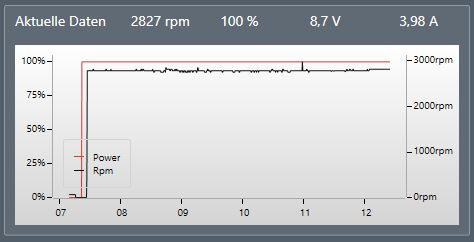 Bei 74% Leistung auf ~1038 rpm werden dann auf einmal 1,35A angezeigt.