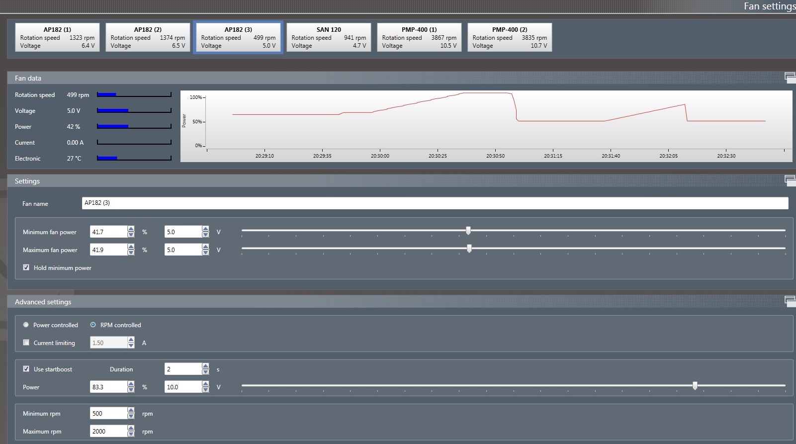 ]I am currently (for demonstration purposes) using a curve controller with the first two ap182 fans, rpm controlled. I have set a limit on the hold minimum power to 6.6v to keep them running. I have tried using a 'constant value' of 100% and using the fan power sliders and can confirm that the fans simply stop when the voltage is less than 6.6v. As you can see in the picture, I have 3 ap182 fans. The first two are running from the curve controller with a 'Hold minimum power' of 6.6v and so are running at the lowest speed I can get them to (around 1270rpm) whilst the 3rd ap182 fan is running on a 'constant value' set to 100% Now when I reduce the voltage down from 12v on the 3rd fan, when I get to 6.5v the fan simply stops. Here's the screenies.