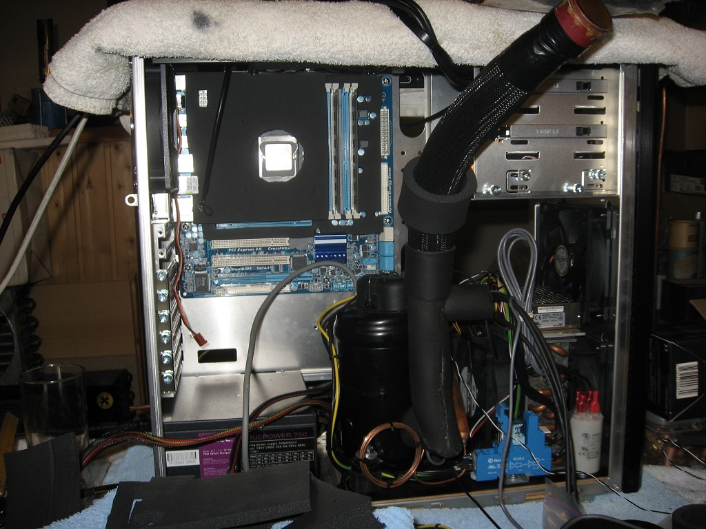 Die Grafikkarte wurde mit einer Wakü ausgestattet und die Kokü im Gehäuse verschraubt. Die Dämmung des Mainboards besteht aus einer dünnen Schicht Knetradiergummi, die das Brücken von Kontakten durch Kondenswasser verhindern soll falls dieses sich bildet. Darauf folgen auf der Vorderseite zwei Schichten 10mm Armaflex und auf der Rückseite 6mm Armaflex da zwischen Maninboard-Tray und Mainboard nur sehr wenig Platz ist. Mit Kondenswasser hatte ich bisher keine Probleme. Weder im Betrieb noch nach dem Abschalten der Kokü.