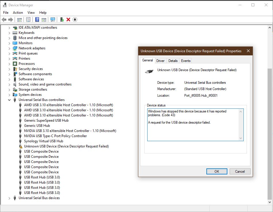 Im Geräte-Manager wird angezeigt, das mit dem Device Descriptor fehlgeschlagen ist.