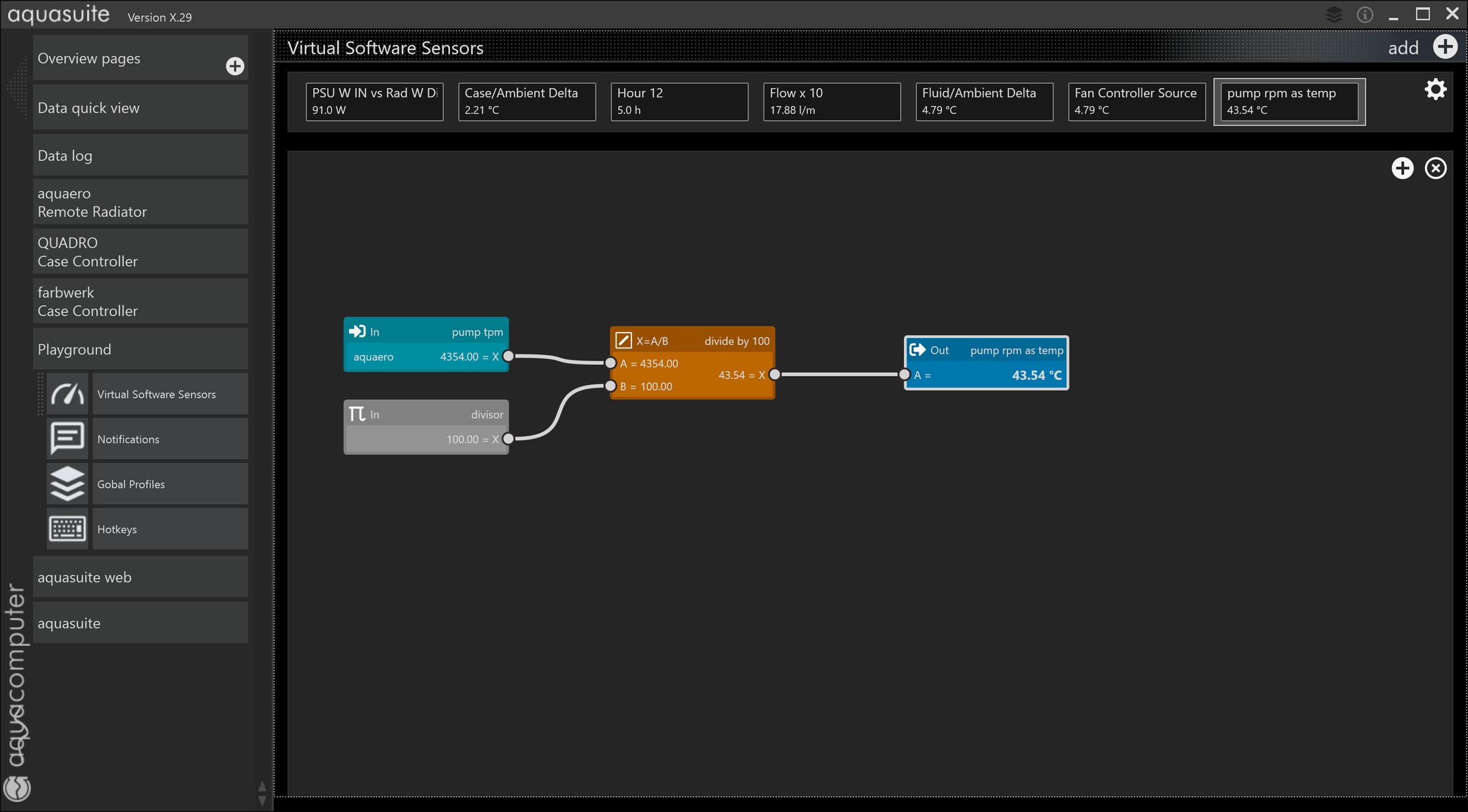 2) Under the "Flow sensors" in the Sensors section of aquasuite, my flow sensor is listed, and correctly set to "Aqua Computer high flow ( 53068 )" for the Calibration value. I do show a reading of ~250 l/h. That being said, I would like to use this flow sensor to dictate the speed at which the PWM Pump operates. I cannot find a way to utilize the flow sensor as an input in the Controllers section.