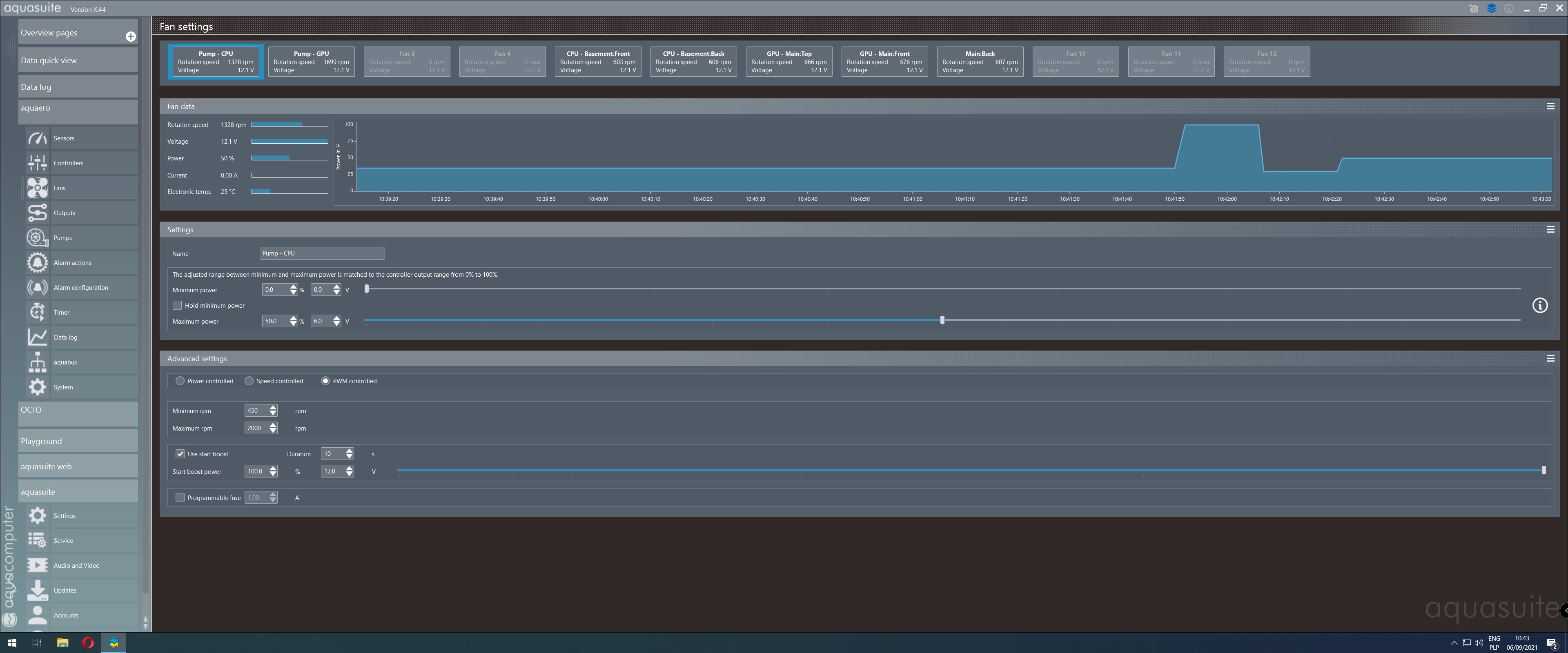 I just finished building my two loop system and I am having trouble with the speed control on one of my pumps. I have two pumps: "Aqua-Computer D5 pump motor PWM - 41105" connected to "Aqua-Computer aquaero 6 LT USB fan controller - 53234". The first one works fine and allows to regulate the speed to about 35% of the PWM signal which gives about 800 RPM. The second one, however, at the level of 1% PWM still rotates at 1810 RPM, and at the level of 50% PWM signal sets the speed to 3699, while the first pump reaches then 1328 RPM. Is it possible that the second pump has interchanged cables for tacho and PWM signal ? Or is the problem in the pump/PWM controller itself ? See attachemtns for screenshots of lates Aquasuit. Is it possible to fix this problem somehow? Thanks in advance for any suggestions.