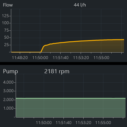 Zunächst dachte ich, dass evtl. die Pumpe nicht läuft, daher habe ich eine weitere (klassische) Durchflussanzeige integriert, die jedoch sofort nach Rechnerstart einen Fluss anzeigt.