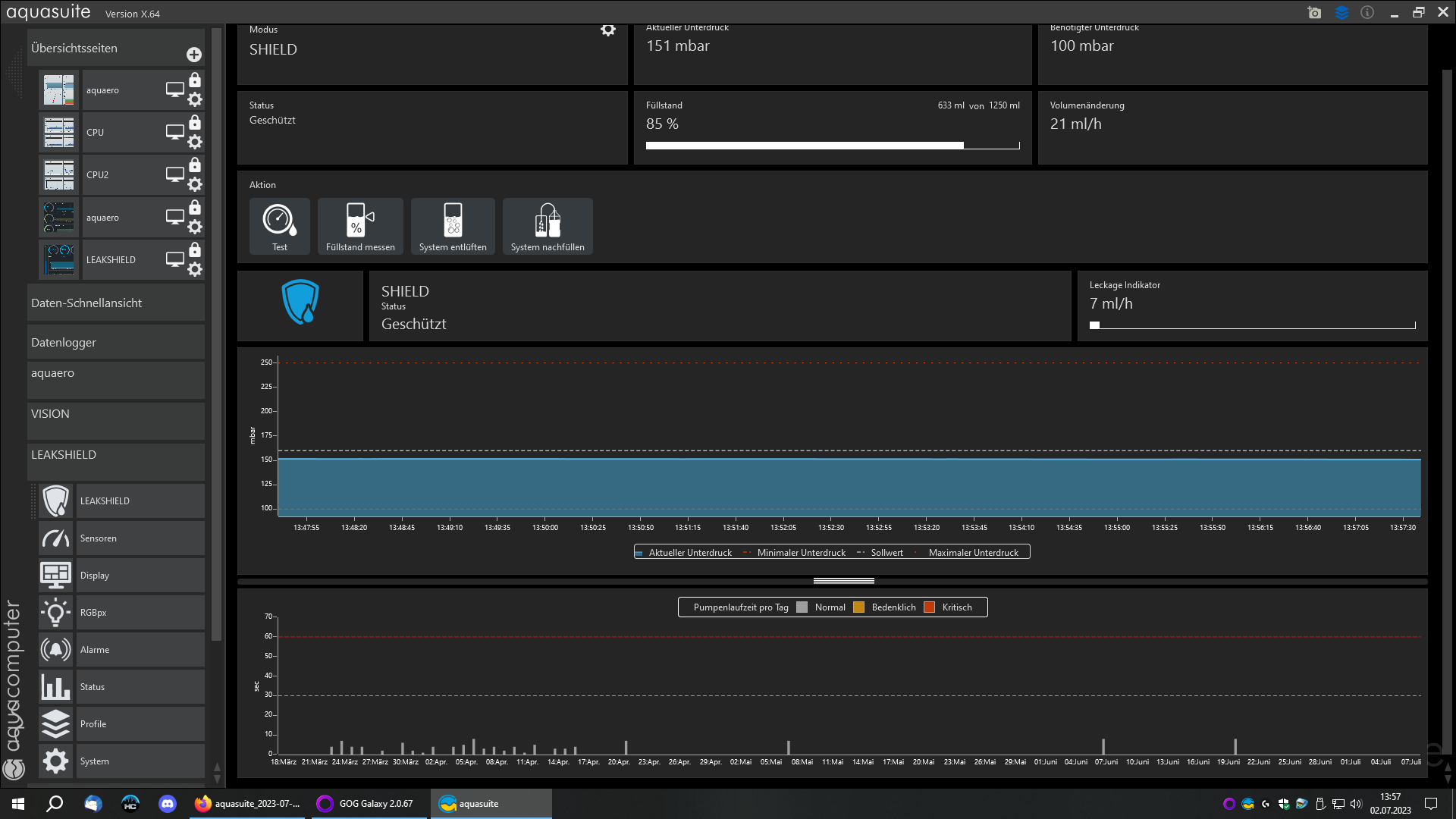 Ich würde die Pumpendrehzahl reduzieren um einen niedrigeren benötigten Unterdruck zu haben, dann hast Du auch mehr Spielraum und das LEAKSHIELD kann sinnvoll arbeiten.