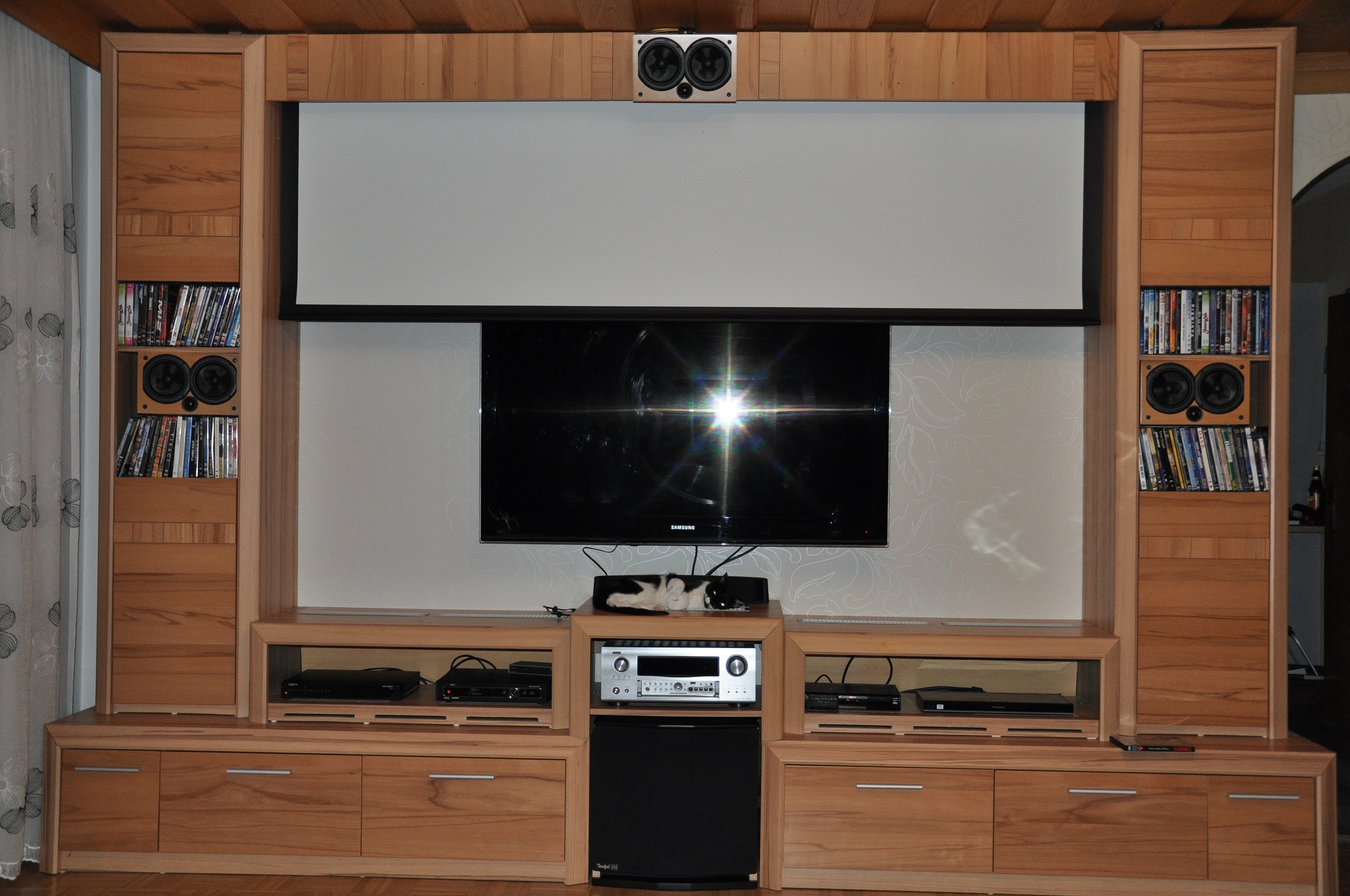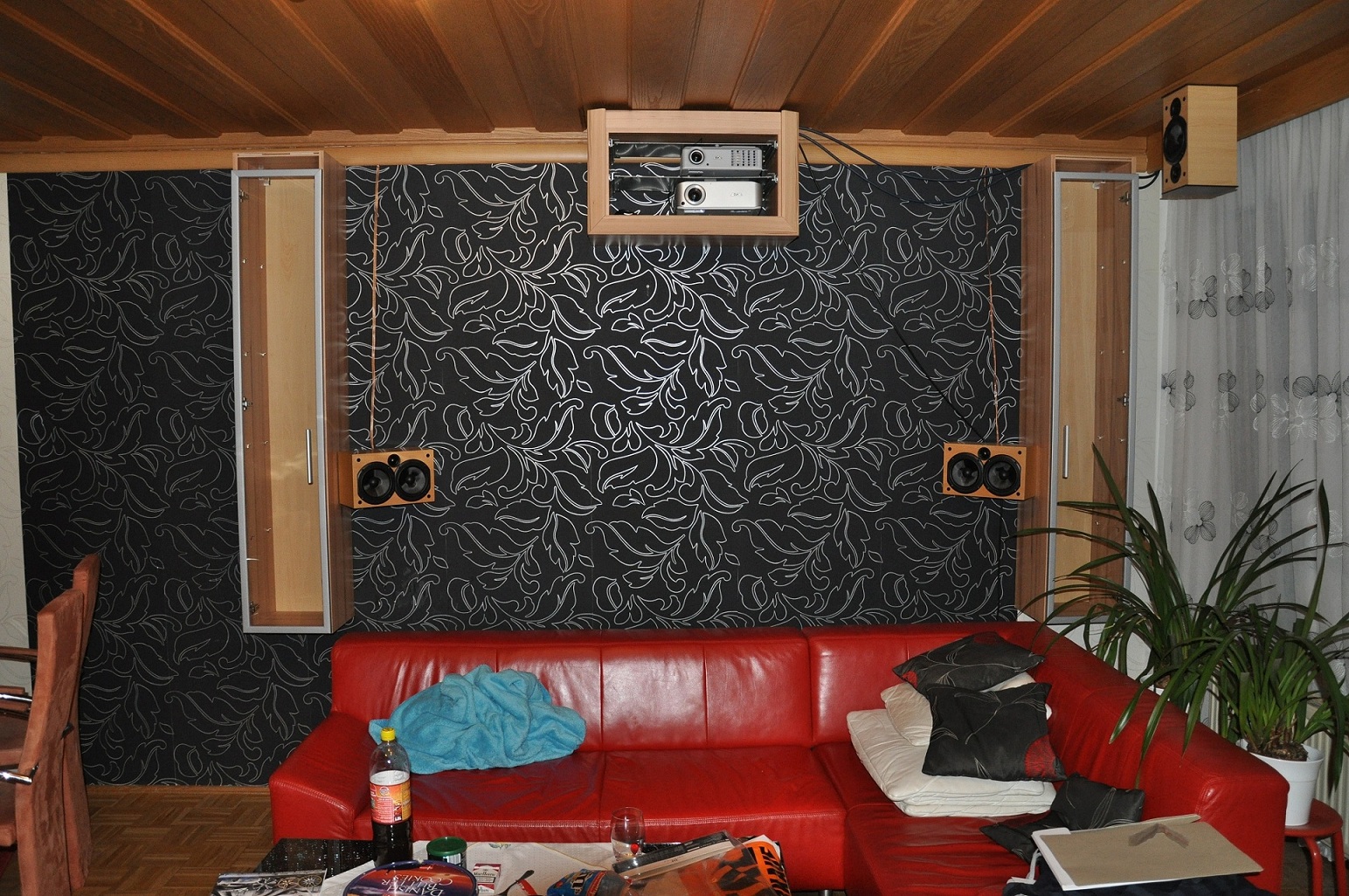 Die Geräte sind recht hübsch in die Möbel integriert. Respekt. Der Fernseher sieht bissel verloren aus in dem "Loch" für die Leinwand. Mein Vater hat aus diesem Zweck einen Rahmen beim Maler/Schreiner anfertigen lassen der die Lücke ringsrum ausfüllt. Mit solch einem Struktur-Putz der ganz nett aussieht.