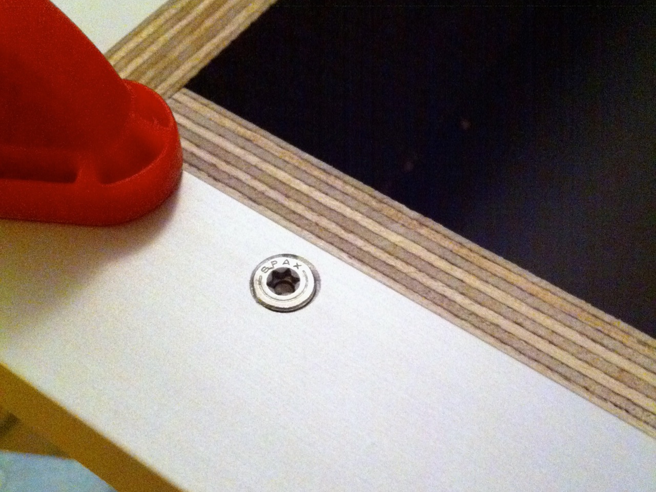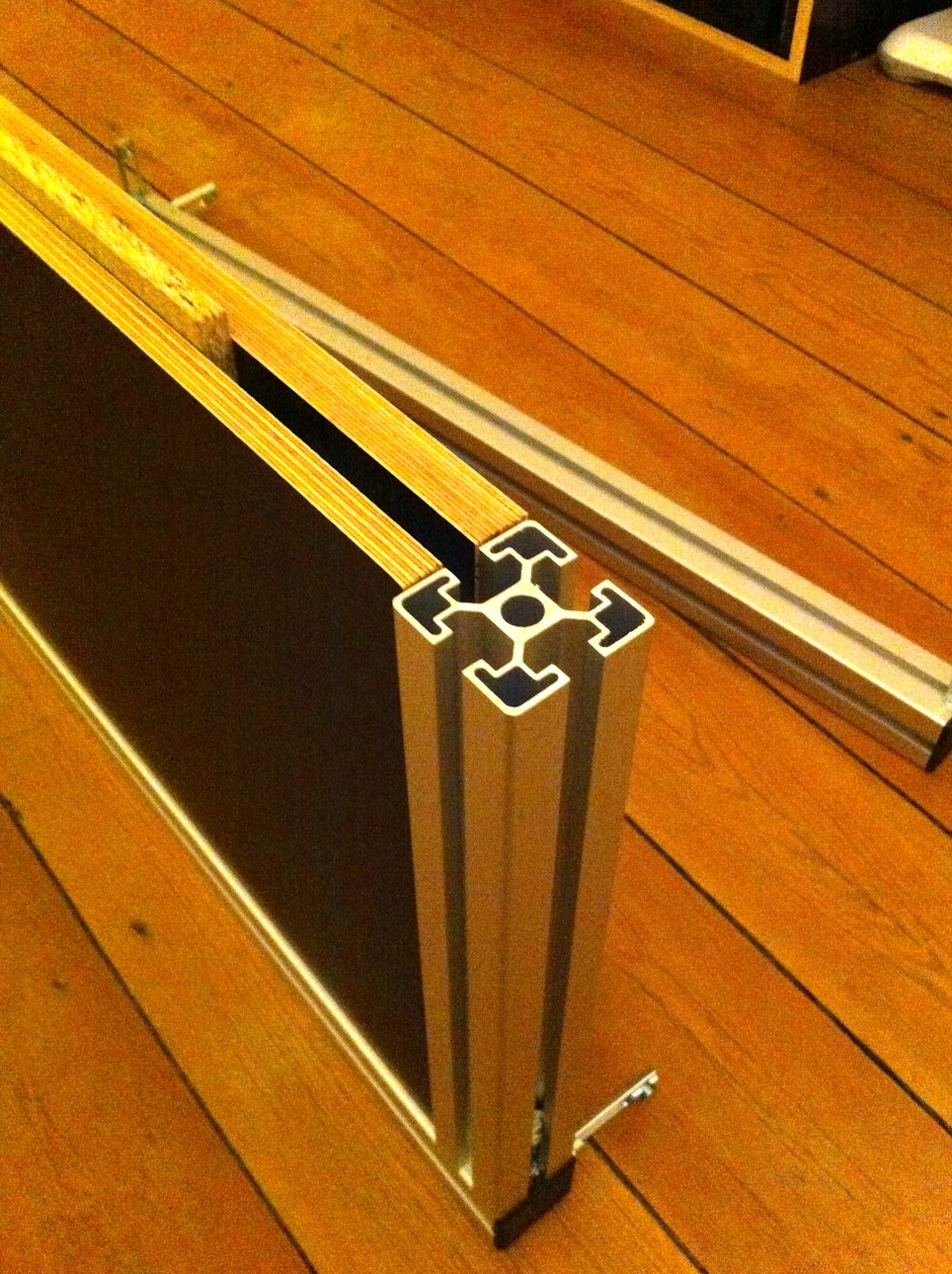 Schwierig war bei der Wahl der Befestigung der Aluprofile, dass ich die Nuten nicht mehr bis in die Ecken nutzen konnte, also habe ich mit "Federn" gebaut. Aus günstigerem Holz. Multiplex ist teuer genug.
