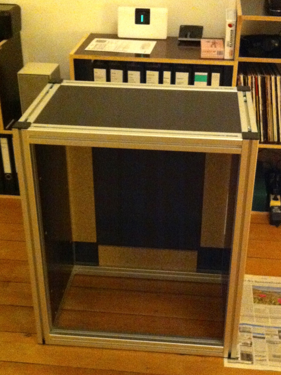 Der Korpus ist jetzt durch die Aluprofile und die eingesetzten Wände und Deckel richtig stabil! Zwischen die Aluprofilnuten und den Holzfedern habe ich Papier gepackt. Dadurch gingen die Federn richtig schön stramm und spielfrei in die Nuten. Da klappert nix!