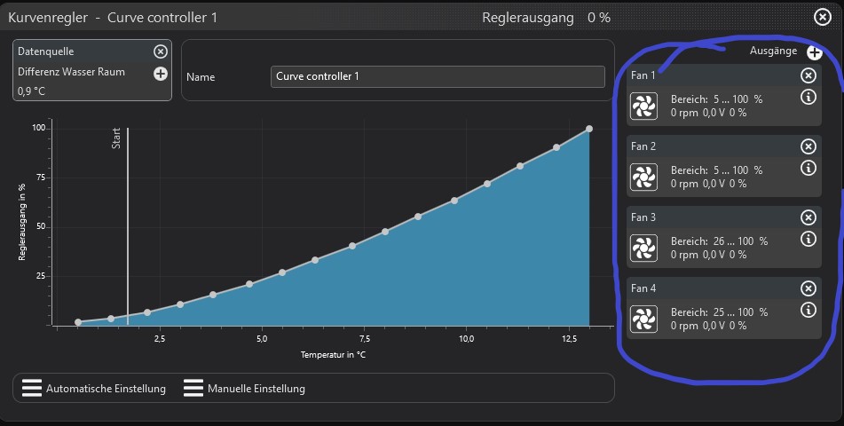 Ich probiere es mal aus! Das würde auf dem ersten blick wirklich Sinn ergbeben, danke! Nur was ich mich frage ist, ich habe die Anfangsleistung auf 10% beim Regler selber. Die 3 Pins habe ich auf Leistungsgesteuert und 30% Minimalleistung und provisorisch 600 u/min Mindestdrehzahl. Beim PWN-Anschluss natürlich auf PWM mit den selben Parametern. Müssten die dann nicht beim Ausgangssignal des Reglers von 0% nicht dann auf die 30% Mindestleistung gehen? Zumindest laut Tests laufen alle Lüfter bis 8% Mindestdrehzahl.Ich mag mich ja irren, aber laut Deinen Bildern sollen Deine Lüfter erst ab einem Delta von ~1,25K loslaufen, zu sehen sind aber 0,9K und 0,4K.