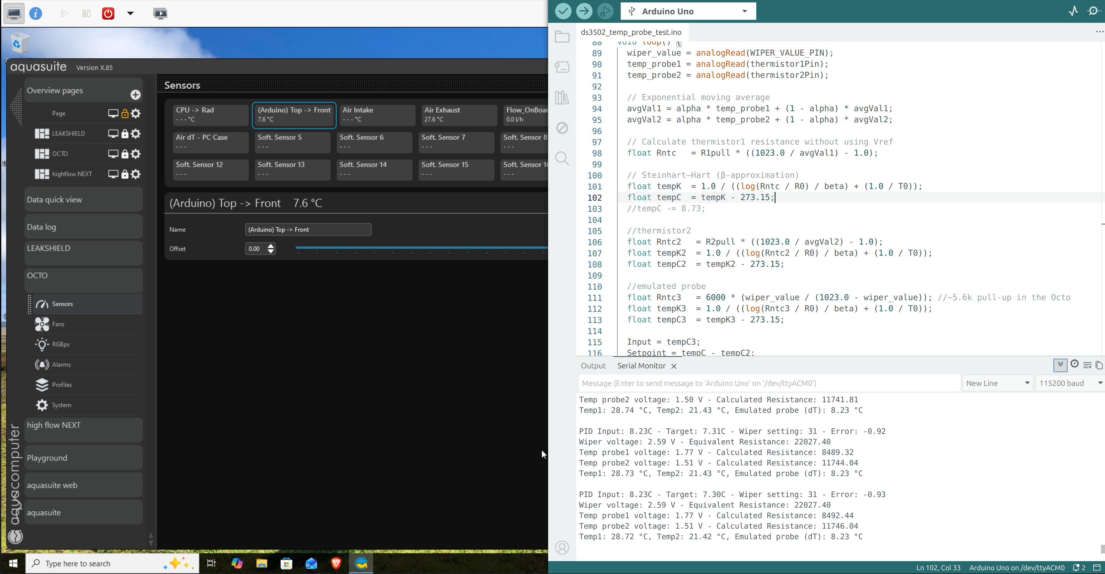 Yeah, I thought about that part. There are multiple ways to go about it. If you are willing to hack the Octo, then you could feed a voltage straight into its ADC, bypassing its own voltage divider.This is a cool idea! You could set up a microcontroller and a few temp sensors as a stand-alone device and write code that will perform the mathematical functions you want on the temp sensors’ data. I would use Arduino-IDE, ESP-IDF, or STM CUBE-IDE, since all of these compile source code into native machine code and flash it as firmware stored in non-volatile memory on the microcontroller. This part is relatively easy. The tricky part is getting the final delta-T value into the Octo and not via USB. The Octo temperature sensor inputs are designed for a 10KΩ NTC thermistor. Internally, I think the Octo provides a known excitation voltage (probably 3.3 V) and includes a fixed precision resistor that forms a voltage divider with the external thermistor. The voltage at the divider junction is measured by an ADC input on the Octo’s microcontroller. From this measured voltage, the known excitation voltage, and internal resistor value, the firmware calculates the effective resistance of the connected thermistor. The calculated resistance is then converted into a temperature value in degrees Celsius using an assumed thermistor model, likely implemented as a Beta-based approximation, commonly B3950Kor an equivalent lookup table derived from a 10 KΩ NTC thermistor characteristic curve. I doubt that the Octo is using Steinhart & Hartcoefficients to calculate the temperature as these are used for levels of precision that are higher than what the Octo targets.Oh, I just got an idea.