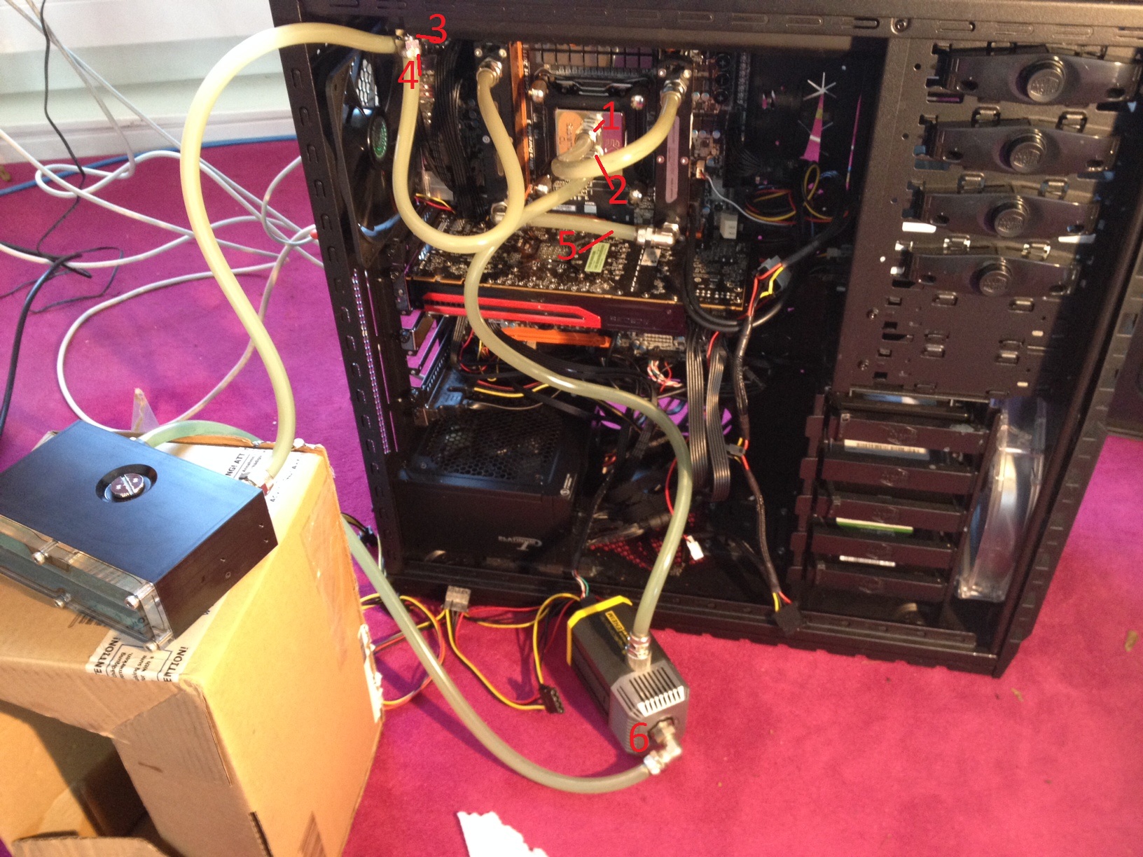 Hast du vielleicht Knicke im Schlauch? Zwischen CPU und rechtem Ram-Kühler siehts mir extrem aus auf deinem Bild. Auch der Schlauch zwischen linkem Ram-Kühler und Radiator sieht mir aus als wenn er leicht abgeknickt ist.