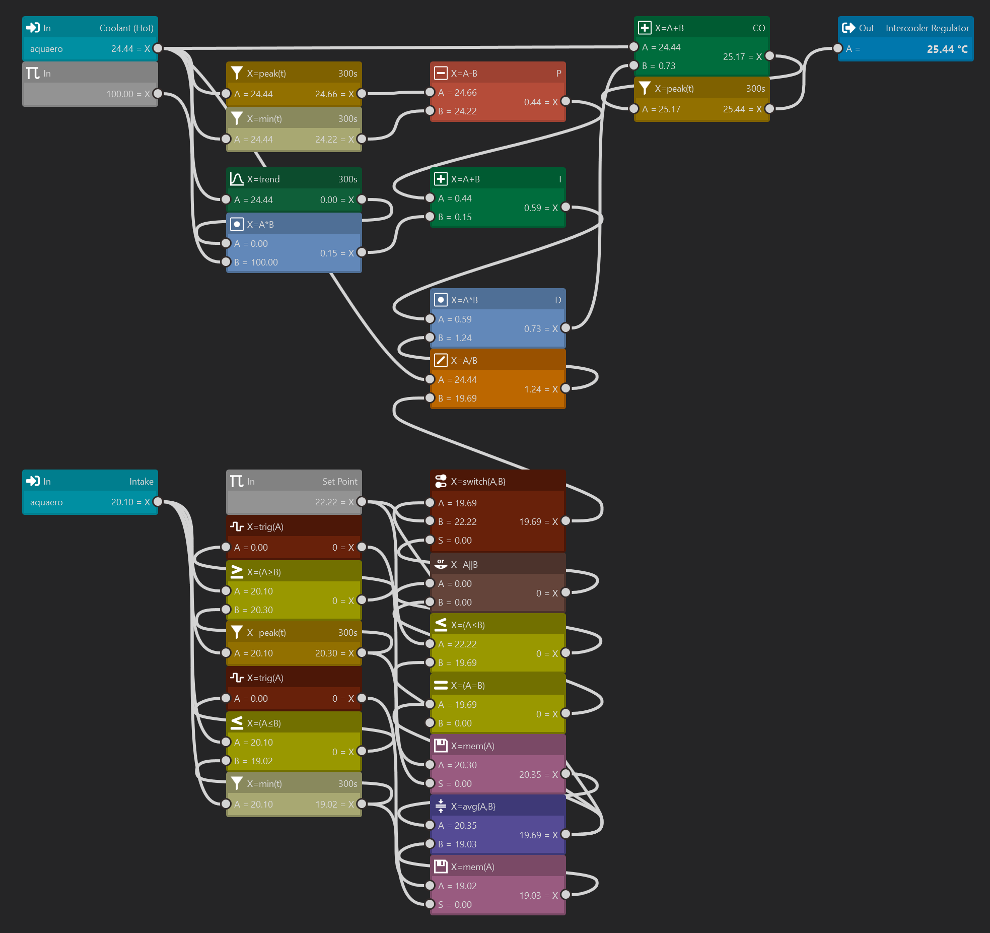 I now understand your confusion. You're looking at the Intercooler Regulator as directly related to fan speed. The Intercooler Regulator is in degrees C. This is mapped to a controller that uses the output to regulate the fan speed based on the set curve. The fans do change accordingly, but only in 10ths of a percent or more depending on the curve and heat bloom. I have added charts dumped into Excel that may help understand the plotting. This chart includes fan speed (in percentage), the hot temperature, room temperature, and the Intercooler Regulator Temperature.uhm.. the sensor doesn't increase fan speed before the water temp on the graph, it either does nothing (staying flat because it never decreased fans speed when it should have) or lags behind every single time as i experienced.