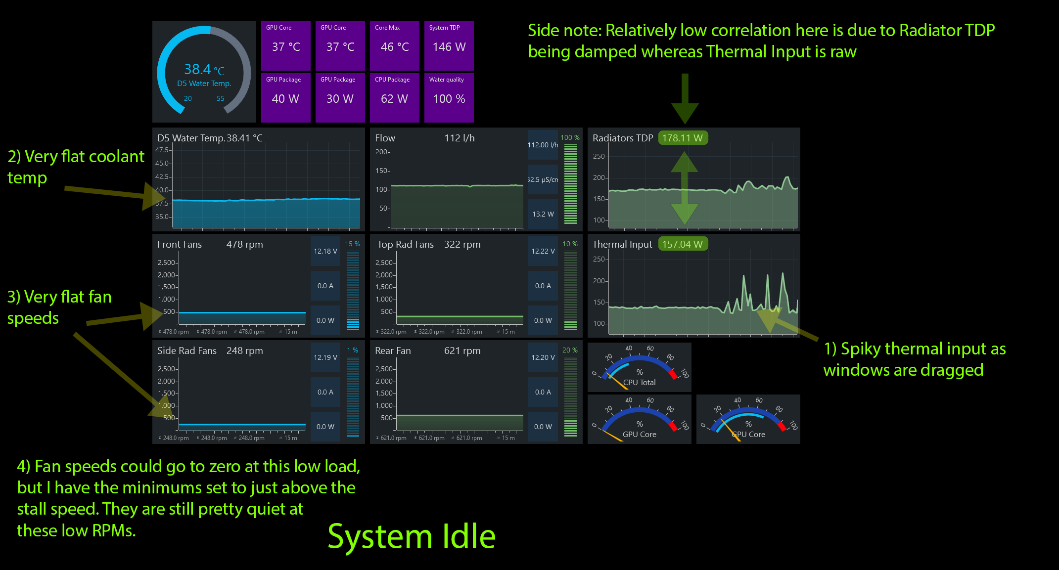 By the way, in a hot day, you don't accelerate fans. Again, it is the delta between ambient and water that governs how much heat the rads can dissipate. if my room is at 35°C and the water at 37, guess what benefit i'll have to set my fans at full speed? none. 2°C, that's an idling computer.