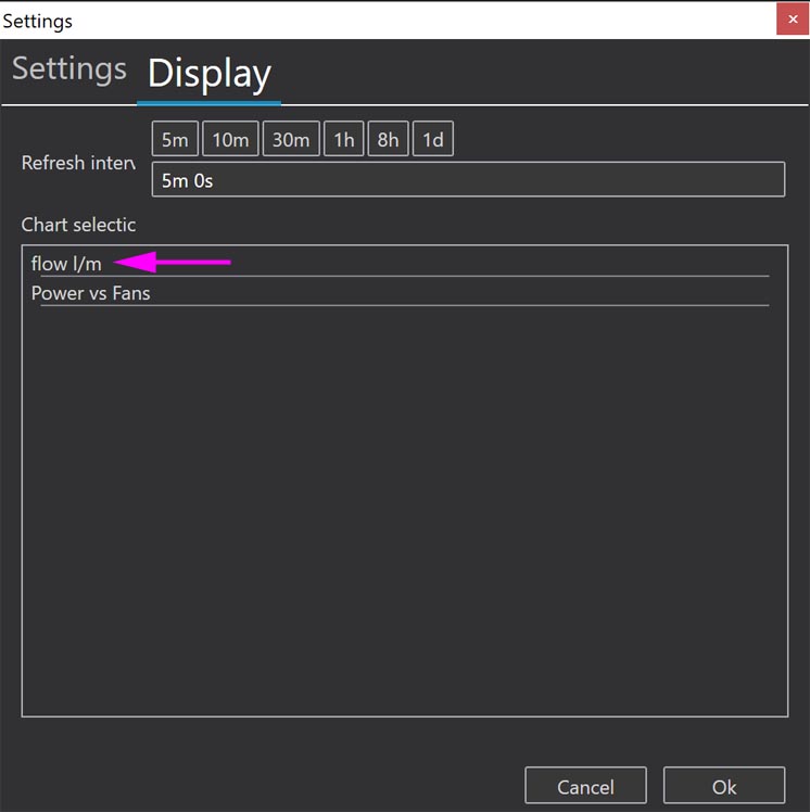 • add Log data chart in overview page, and select the Analyze data chart containing Flow @ l/m (display_data.jpg)