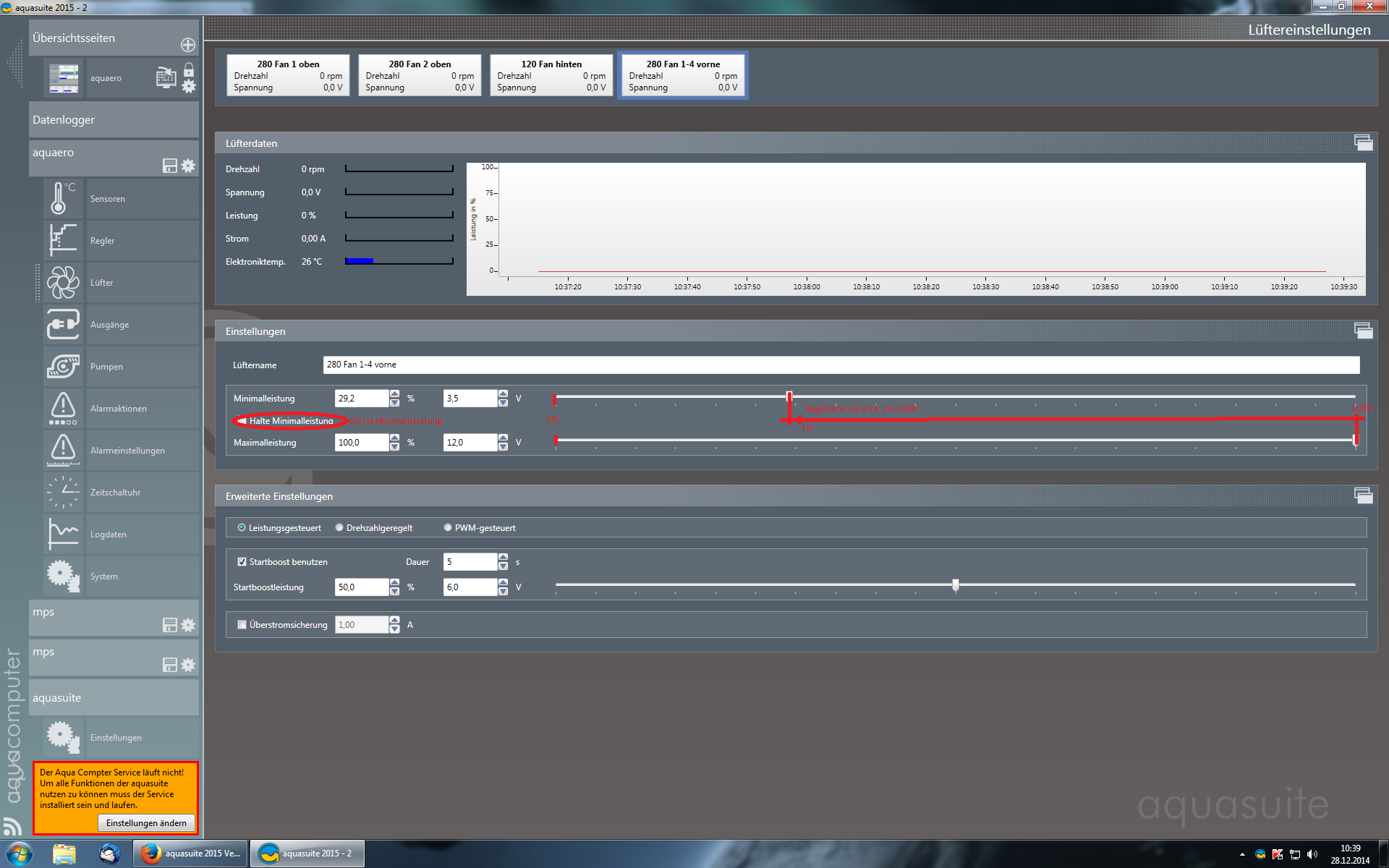 Setzte das aquaduct mal über das menü auf Werkseinstellungen zurück. Wir prüfen hier intern auch noch mal. Das sieht auf jeden fall so nicht normal aus.ch habe nun folgendes herausgefunden, wenn ich den Kurvenregler auf 50° einstelle, so dass dieser erst gar nicht die Lüfter aktivieren sollte und in der Lüftersteuerung den Haken bei Minimalleistung aktiviert lasse, drehen die Lüfter auf Minimalleistung.
