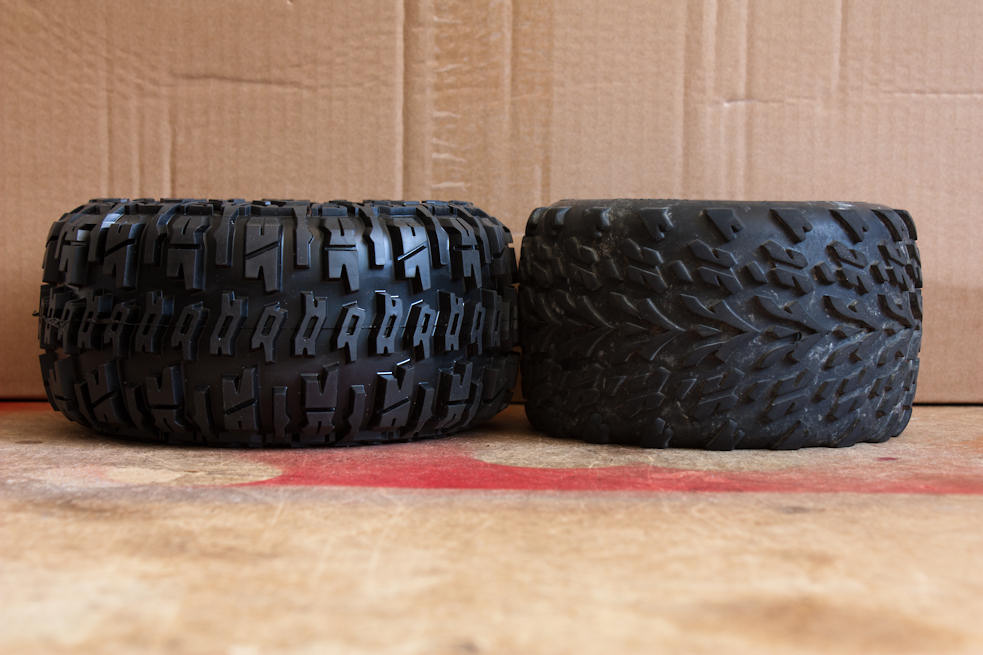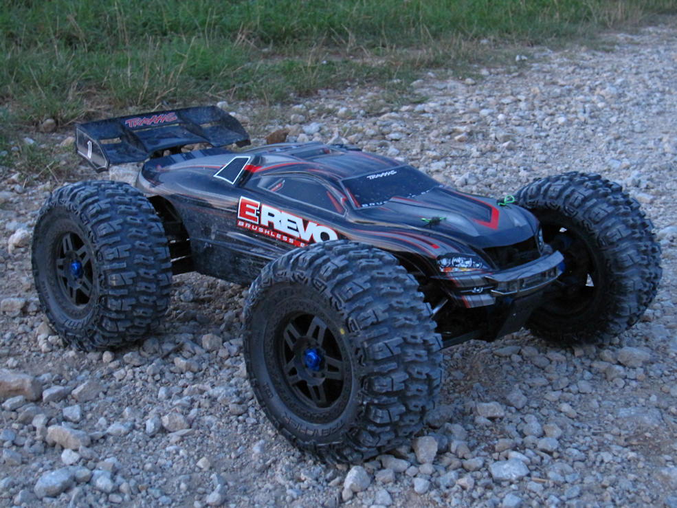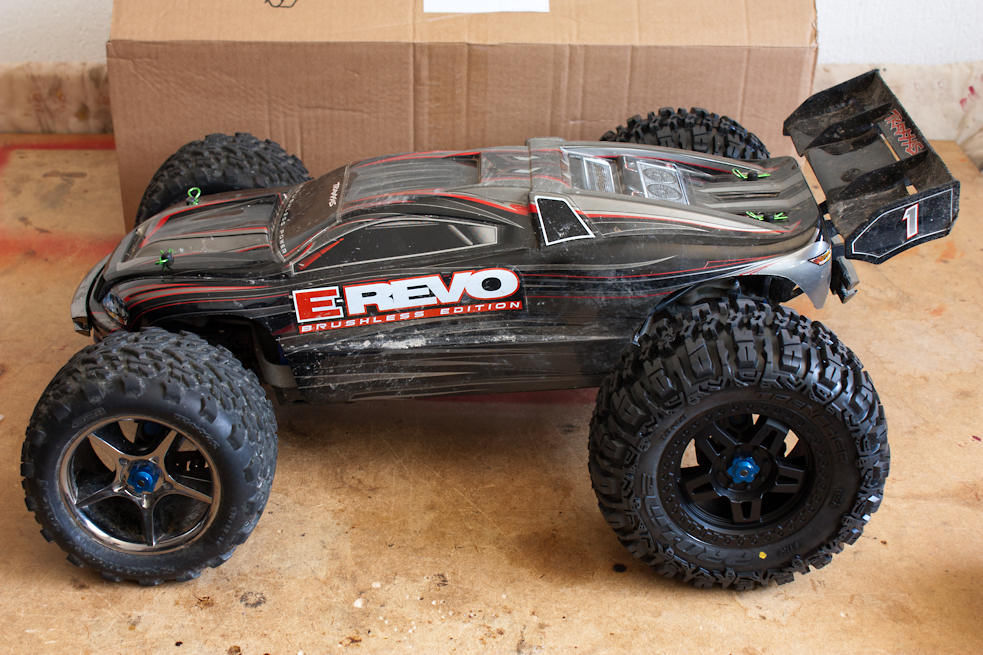 Zu den Proline Trencher: Also 2,5cm mehr Durchmesser macht sich echt bemerkbar, der E-Revo steht richtig fett da. Deutlichst bemerkbar ist der wesentlich höhere Griplevel: Auf Asphalt (Backflip aus dem Stand) und auf der Wiese (dauernd Wheelies) muss man echt seinen Gasfinger zügeln. Selbst auf Schotter macht der E-Revo jetzt Wheelies bei Vollgas! :thumbsup: