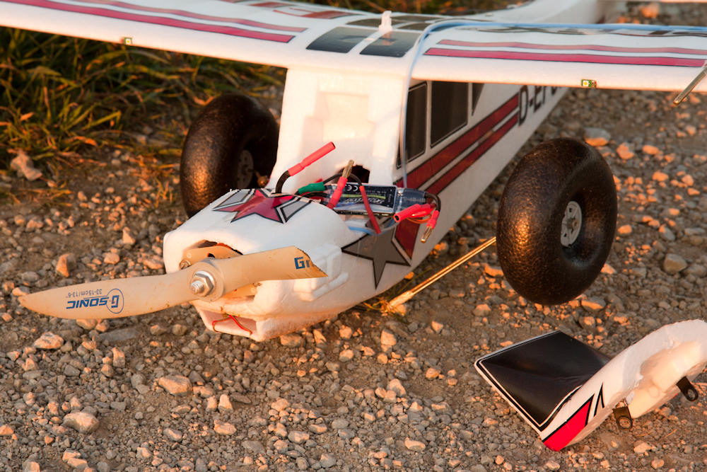Sodele, heute war Erst-/Letztflug mit dem neuen Motorspant! Die gute Nachricht: Auch im Flug keine Vibrationen, die FunCub ist echt durch die Luft geschnurrt. Die schlechte: Beim zweiten Akku gab es kurz nach dem Start plötzlich keinen Empfang mehr, der PCM-Empfänger ging auf Hold und die FC machte eine Flachköpper ins Feld. Das Modell ist aus 5m Höhe in einem Winkel von etwa 40° und mit Viertelgas (ohne Klappen) eingeschlagen. Und durch die Belastung am Boden (der Motor wollte halt immer noch mit Viertelgas weiterdrehen) ist mir dann auch noch der Motor durchgebrannt...![]()