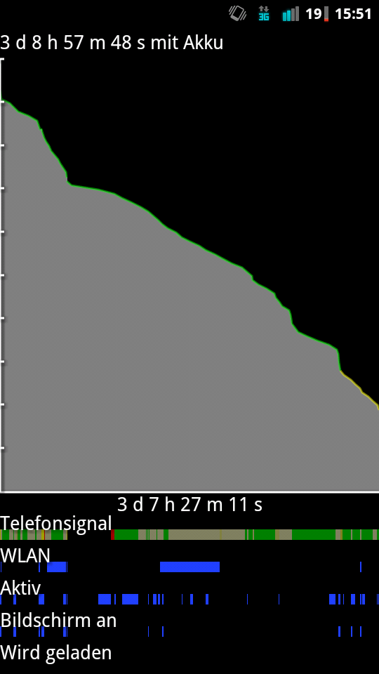 15 Stunden leer ?! Da is sau der Witz, das muss mit der Betriebsversion oder App Kombi zusammen hängen. Geht dein LG vielleicht nicht in den Deep Sleep Mode ? CPU Spy, kann sowas auslesen.. Mein S2 hält mit gelegentlich Mails checken und paar SMS aufjedenfall 3 Tage ... wobei der dritte Tag dann wohl so bei 20% wäre, was mir für den Notfall eh zu wenig wär ^^