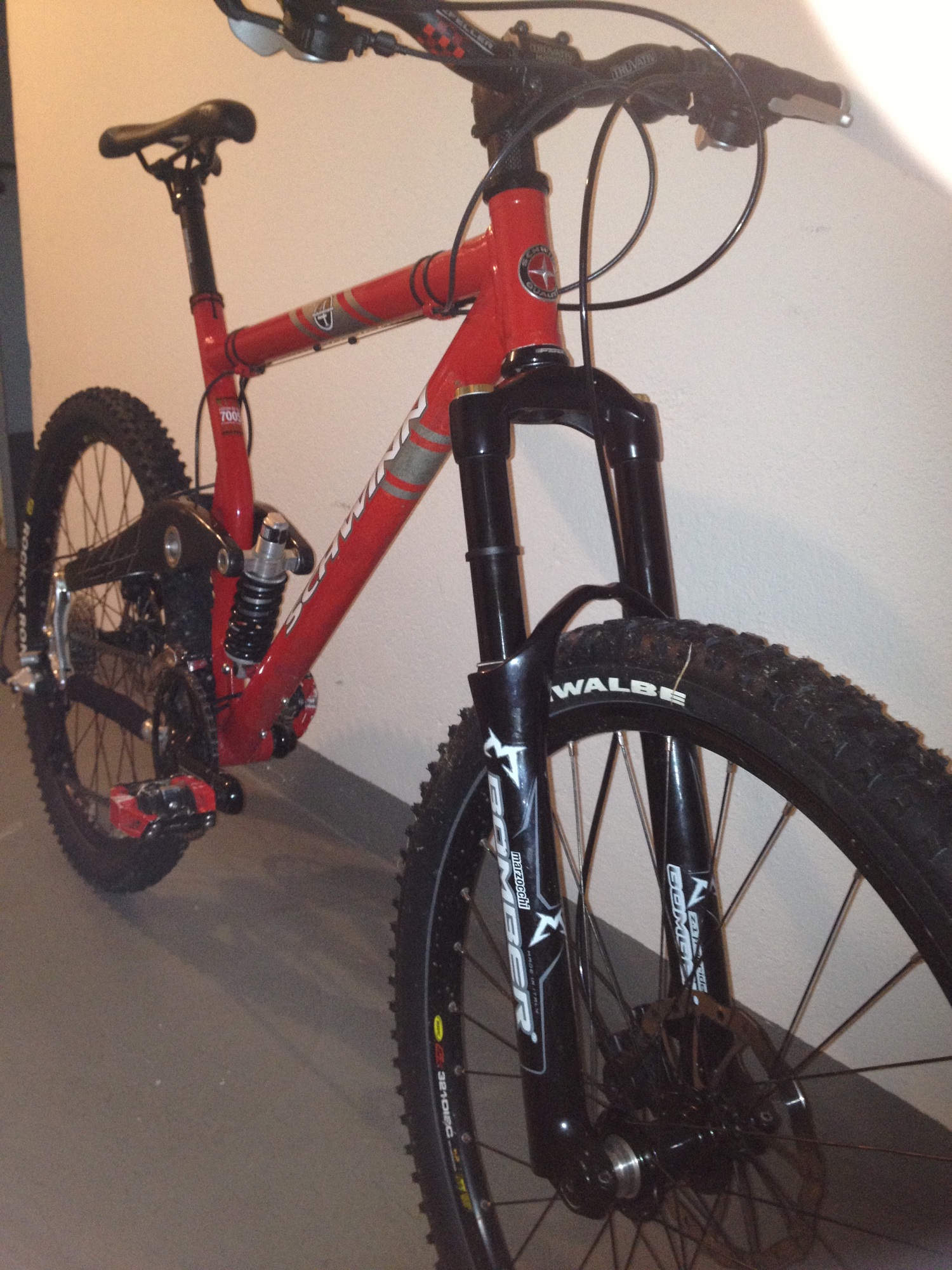 Ja, die Bremsleitung vorne ist so ne Sache. Kurz is die schon, aber es funzt. Nach meinem Bremsdebakel fass ichd ie Bremse nimmer an, solang die noch funzt wie sie soll. Beim nächsten entlüften werd ich die Leitung mal tauschen. Aber schon irre, was 1cm mehr Steuerrohr und 4cm mehr Federweg ausmachen.